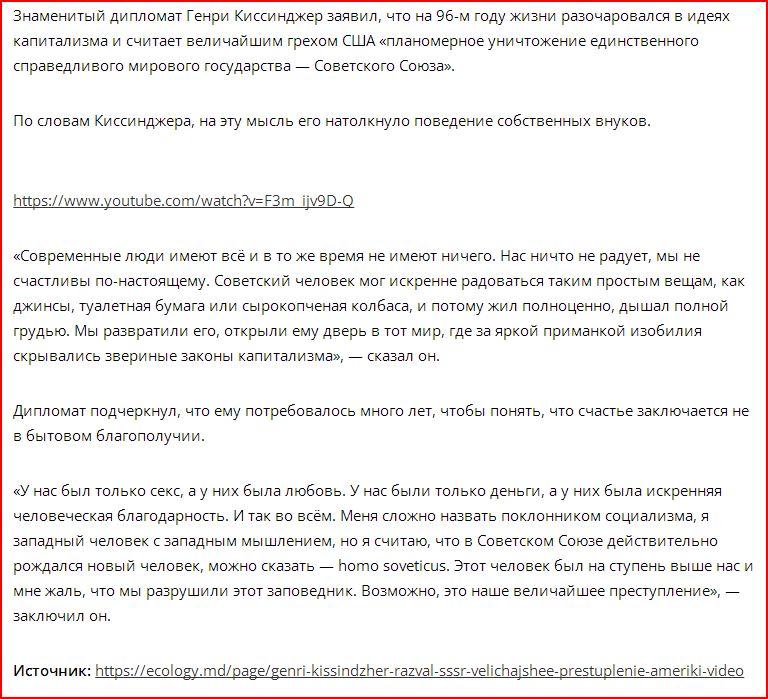 Знаменитый дипломат Генри Киссинджер заявил, что на 96-м году жизни разочаровался в идеях капитализма и считает величайшим грехом США «планомерное уничтожение единственного справедливого мирового государства — Советского Союза». По словам Киссинджера, на эту мысль его натолкнуло поведение собственных внуков. https://www.youtube.com/watch?v=F3m_ijv9D-Q «Современные люди имеют всё и в то же время не имеют ничего. Нас ничто не радует, мы не счастливы по-настоящему. Советский человек мог искренне радоваться таким простым вещам, как джинсы, туалетная бумага или сырокопченая колбаса, и потому жил полноценно, дышал полной грудью. Мы развратили его, открыли ему дверь в тот мир, где за яркой приманкой изобилия скрывались звериные законы капитализма», — сказал он. Дипломат подчеркнул, что ему потребовалось много лет, чтобы понять, что счастье заключается не в бытовом благополучии. «У нас был только секс, а у них была любовь. У нас были только деньги, а у них была искренняя человеческая благодарность. И так во всём. Меня сложно назвать поклонником социализма, я западный человек с западным мышлением, но я считаю, что в Советском Союзе действительно рождался новый человек, можно сказать — homo soveticus. Этот человек был на ступень выше нас и мне жаль, что мы разрушили этот заповедник. Возможно, это наше величайшее преступление», — заключил он. Источник: https://ecology.md/page/genri-kissindzher-r...e-ameriki-video Сообщение отредактировал Fiona - 17.10.2022, 14:35 -------------------- У меня все есть. Заставьте меня не работать