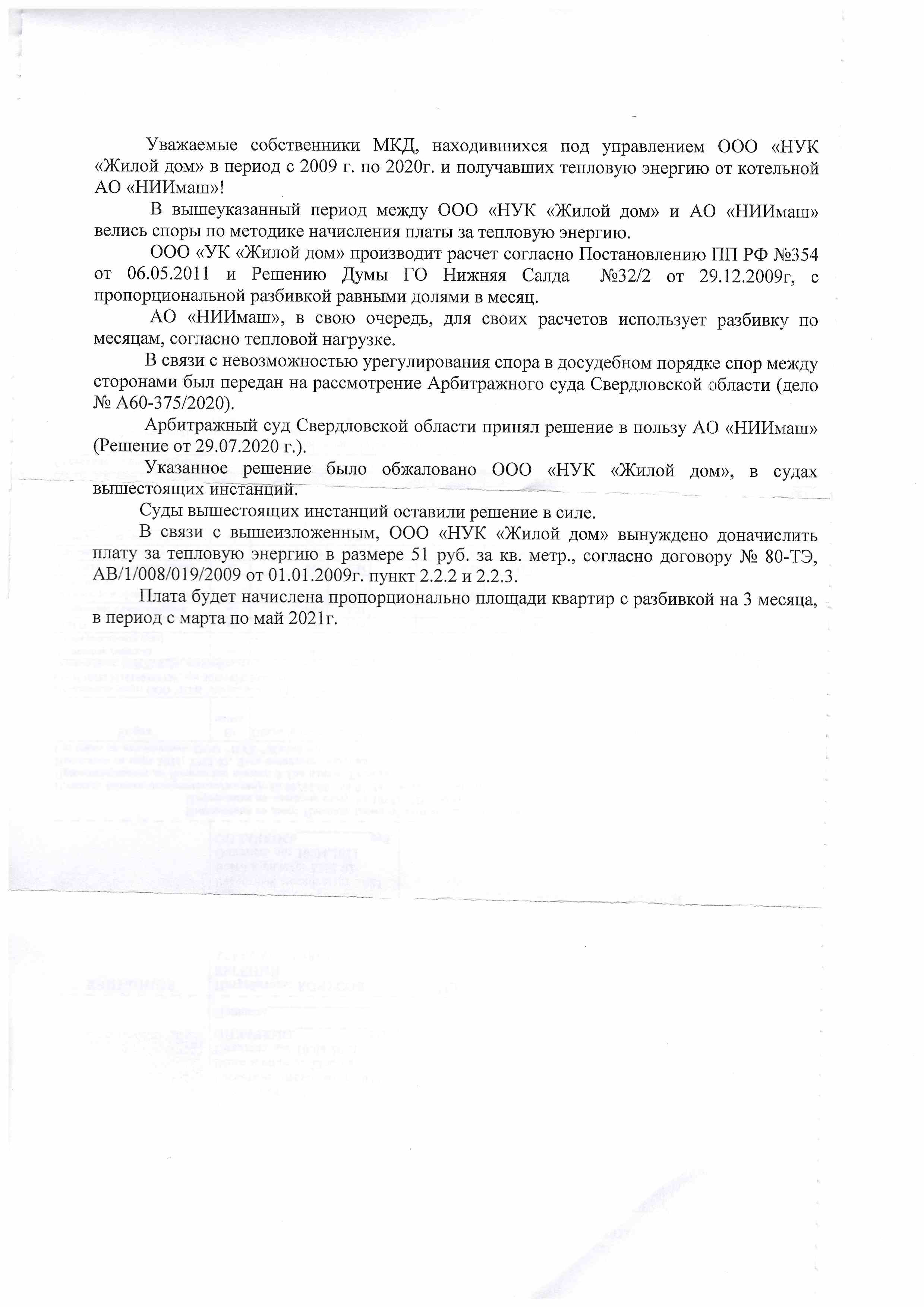 Пришли платежки на оплату ЖКХ. А там подарок, на 1100 рубликов. И еще два таких же в за апрель и май будет. Это НУК " Жилой дом" суд НИИМашу проиграл. Не сошлись в методике расчета тепловой энергии. Документы прилагаю. Я все платежки оплачиваю вовремя. Задолженности по оплате нет. И вот, с ровного места я должен оплачивать задолженность Управляющей компании перед НИИМашем. Почему это с 2009 года тянулось? Платежи, которые вносились "Жиллым домом" в спорный период (2016-2019) истец отнес на старую задолженность. Представленный НУК расчет суд отверг. Они даже НДС забыли посчитать)))) Я-то в чем виноват? Что юристы не работают? Договор между мной и НУК "Жилой дом" я исполнил полностью. А вот почему раньше этот вопрос не решался? Если бы эти 3500 рублей раскидать на 10 лет, то я и не заметил бы. Ваше мнение?