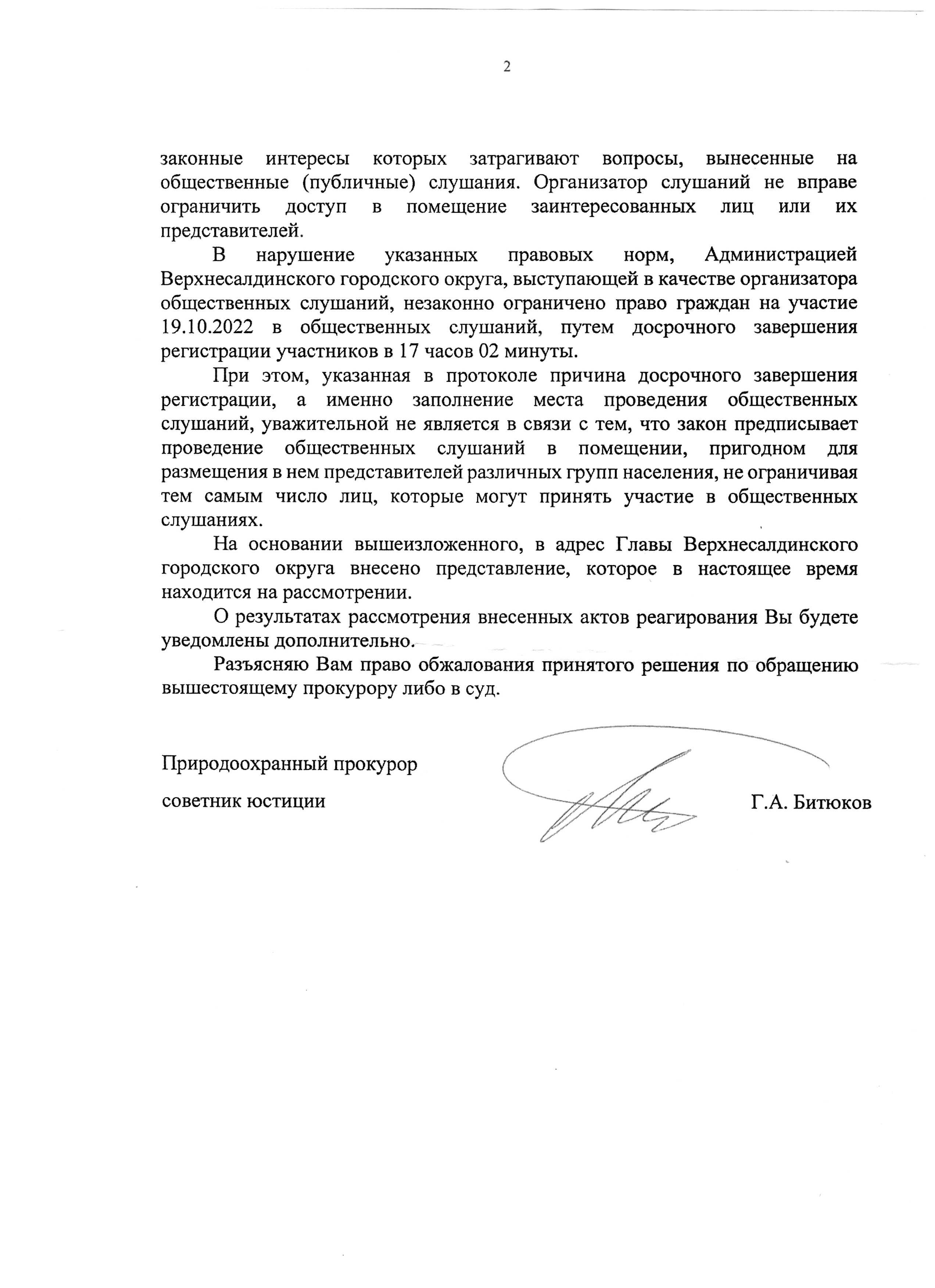 На этой неделе пришел ответ на обращение из прокуратуры. Действия Администрации Верхнесалдинского городского округа незаконны при проведении общественных слушаний. Отсканирую выложу