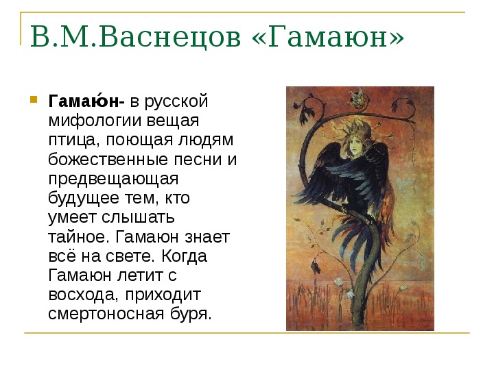 Гамаюн, птица вещая (картина В. Васнецова) На гладях бесконечных вод, Закатом в пурпур облеченных, Она вещает и поет, Не в силах крыл поднять смятенных... Вещает иго злых татар, Вещает казней ряд кровавых, И трус, и голод, и пожар, Злодеев силу, гибель правых... Предвечным ужасом объят, Прекрасный лик горит любовью, Но вещей правдою звучат Уста, запекшиеся кровью!. Александр Блок. -------------------- Зачарованно глядит