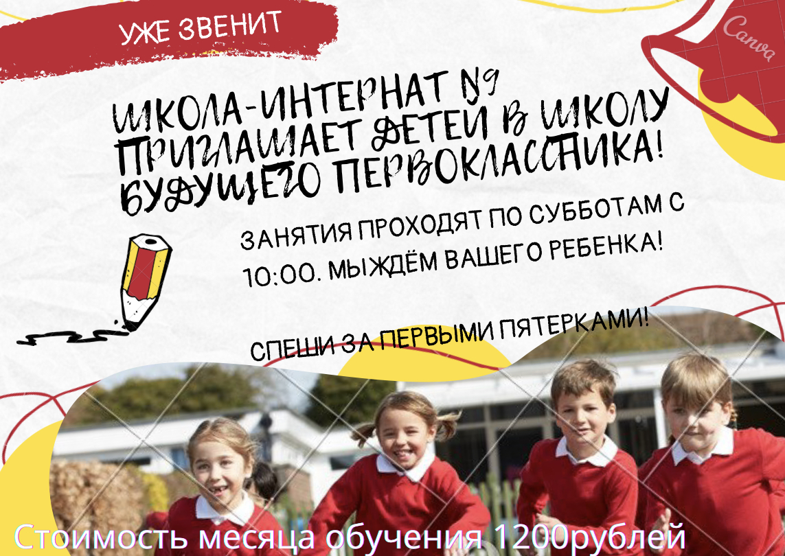 Школа-интернат N9 приглашает будущих первоклассников! Занятия проходят по субботам с 10:00. Стоимость месяца обучения составляет 1200р. Для зачисления нужно подойти к секретарю (при себе иметь паспорт, свидетельство о рождении ребёнка) и заполнить заявление. Мы ждём вашего ребёнка! |