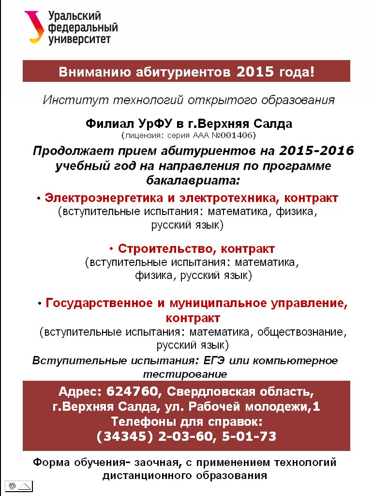 Абитуриенты, ориентирующиеся на поступление на дневную форму обучения, учитывайте, что если у вас результаты ЕГЭ ниже минимального порога, установленных УрФУ (математика и физика - 40, русский-36, возможны небольшие корректировки), то, к великому сожалению, мы Вас не сможем взять. Конечно, это глупо и обидно, когда не хватило одного-двух баллов, но правила устанавливает головной ВУЗ. Минимальный порог по математике по УРФУ на 2015 год 35 баллов, не? http://urfu.ru/fileadmin/user_upload/commo...zmenenijami.pdf |