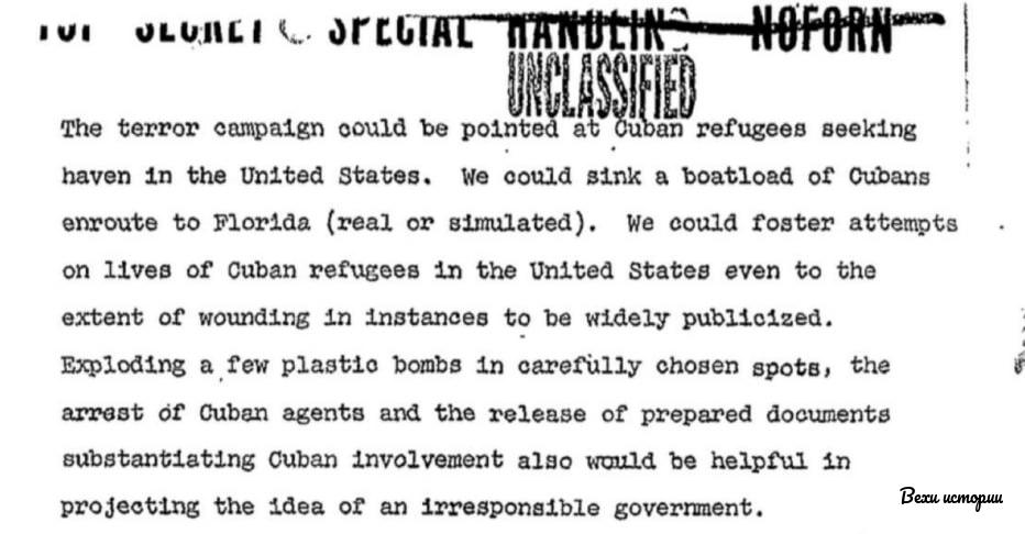 В США расшифровали документы операции "Нортвудс" времен Холодной Войны. Вскрылось что ЦРУ официально предлагала устроить теракты в Майами и Вашингтоне чтобы свалить вину за них на Кубу и объявить стране войну. А еще, планировались убийства американцев в которых ЦРУ хотела обвинить кубинцев чтобы раскрутить маховик ненависти. |