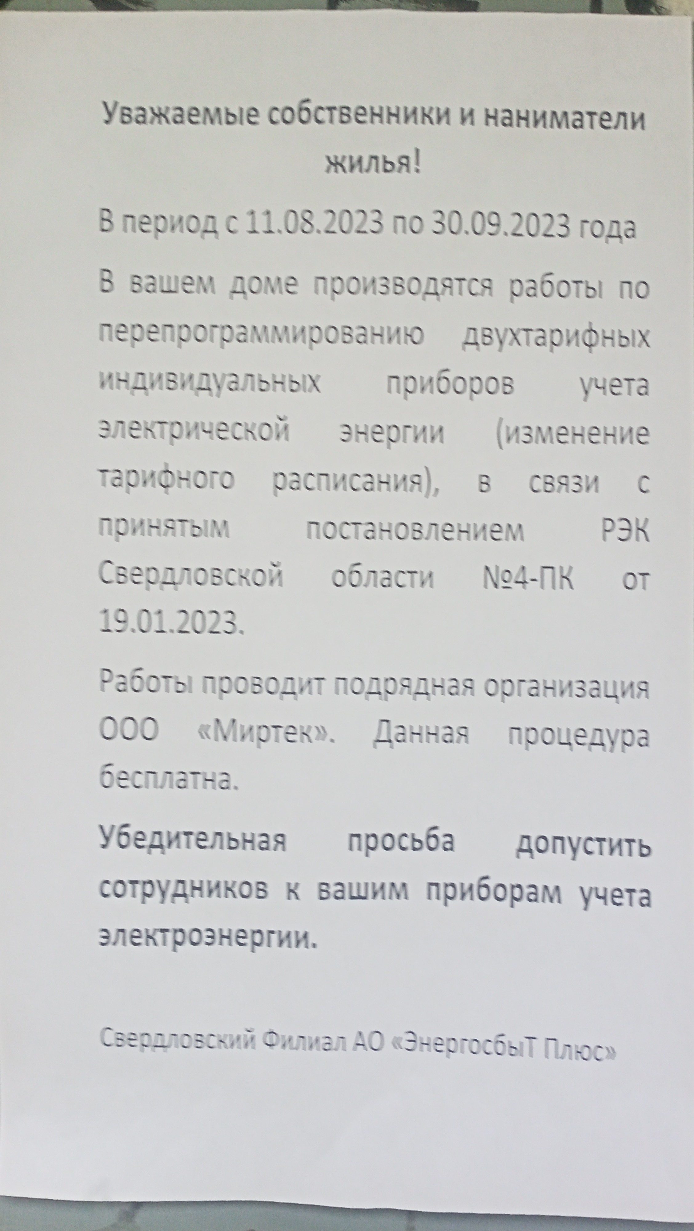 Ну вот у нас сегодня на дверях подъезда висело такое объявление. А вечером на электронку пришло сообщение: Уведомляем, что Ваш прибор учета электрической энергии перепрограммирован в соответствии с действующим тарифным расписанием зон суток в августе 2023 г., что позволяет достоверно проанализировать энергопотребление днем и ночью и принять решение о выборе оптимального варианта тарифа. Если после анализа электропотребления Вы решите перейти к тарифу «День/Ночь», сообщите через Личный кабинет клиента «ЭнергосбыТ Плюс» или офис «ЭнергосбыТ Плюс». -------------------- Можешь помочь человеку – помоги, не можешь помочь – помолись, не умеешь молиться – подумай о человеке хорошо! И это уже будет помощь, потому что светлые мысли – это тоже оружие!