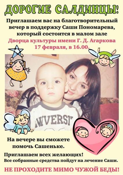 Юлия Пономарёва (мама Саши): - Благотворительный концерт в поддержку моего сына прошёл на Ура !!! Было собрано 150 тысяч !!! Спасибо всем тем, кто пришёл на концерт и поддержал нас !!! Огромнейшее спасибо организаторам концерта - Кадочниковой Оксане и Машарскому Глебу !!! Благодаря их инициативе конецрт состоялся ) Отдельное огромное спасибо всем участникам: Алиевой Альбине ( Альбиночка, СТИХ ШИКАРНЫЙ !!! ) и Салангиной Ульяне (спасибо за позитивные песенки ); Ковбасюк Юлии ( песня про родителей... без комментариев... плакали все ) ; Маколкиной Евгении ( красивый и сильный голос ); Детской школе искусств ( девочки - супер ) ; танцевальному коллективу ДК. им. Агаркова (мальчики и девочки - вы такие молодцы!) ; танцевальному коллективу "Экспрессия" ( спасибо, девушки за красивый танец ). Большое спасибо ДК им. Агаркова в лице Светланы Владимировны Куличенко за предоставленную площадку для концерта ! Благодарю за информационную поддержку Медиахолдинг "Квант" и МО "Восхождение" ! Большое спасибо мэру нашего города Нистратору Сергею Львовичу за посильную материальную помощь, и всем тем, кто внёс свой вклад для лечения моего сына !!! Сообщение отредактировал Кисюличка - 25.2.2013, 11:45 |