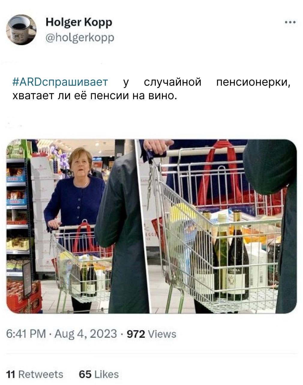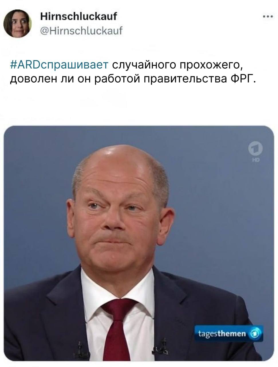 Не только в России такое бывает… Комедия от немецкого ТВ в двух актах: Tagesschau уж очень хотел оправдать повышение цен на мясо во имя защиты природы. Для такой благой цели каналу пришлось выдать своего собственного журналиста за обычного покупателя. Ханна Мертес нарадоваться не могла дороговизне мясца, в отличие от рядовых бюргеров: педалирование «зелёной» повестки никто не отменял! Bild и вывел Ханну и её начальников на чистую воду. Tagesschau божился, что это совпадение. С кем не бывает! И быстренько удалил фрагмент с фрау Мертес. https://www.bild.de/politik/inland/politik-...94236.bild.html В сети твиттер поперли мемасики по теме |