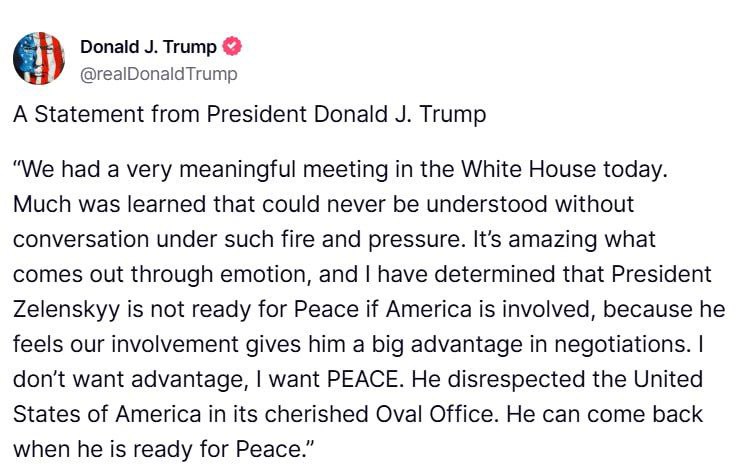 Заявление президента Дональда Трампа: «Сегодня у нас была очень значимая встреча в Белом доме. Мы узнали много такого, чего никогда не понять без разговора с таким запалом. Удивительно, что может выйти через эмоции, и я понял, что президент Зеленский не готов к миру, если Америка будет на его стороне, потому что он чувствует, что наше участие дает ему большое преимущество в переговорах. Мне не нужно преимущество, я хочу МИРА. Он проявил неуважение к Соединенным Штатам Америки в их заветном Овальном кабинете. Он может вернуться, когда будет готов к миру».(с) Сообщение отредактировал Ivan Sherbacov - 28.2.2025, 23:46 |