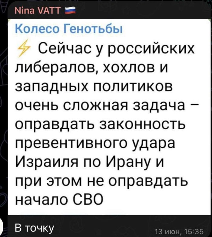 Кирпич, ну что ж ты на такой простой вопрос ответить не можешь? Украина разрабатывала ядерное оружие и грозилась уничтожить РФ? - вот тебе и ответ. А сейчас попробуй ответить еще на один вопрос, посложнее. Если оправдывают типа превентивное СВО, то почему осуждают превентивный удар Израиля? Сообщение отредактировал СТС - 15.6.2025, 12:13 |