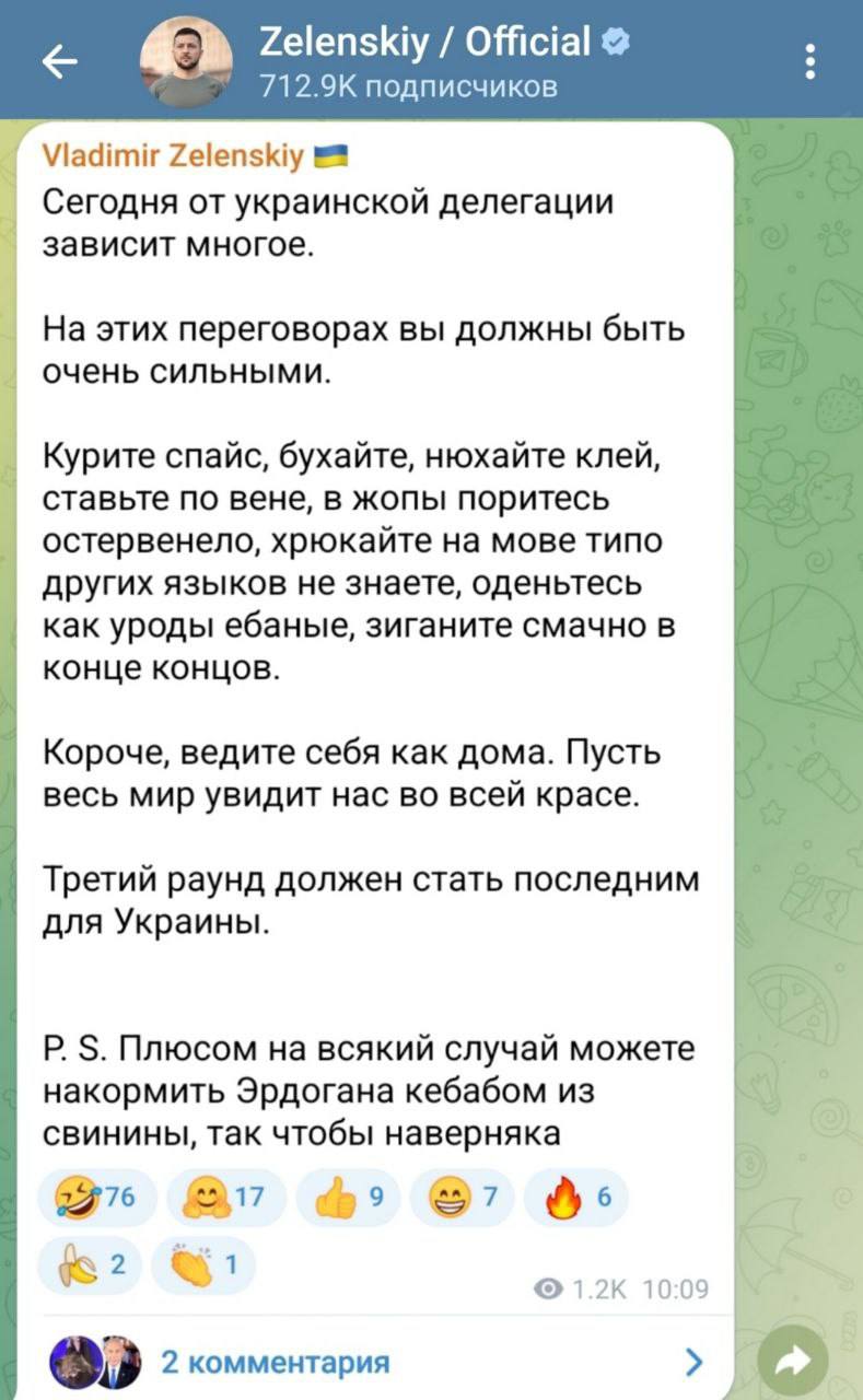 Переговоры, в смысле заключения Мира или Пере-мирия, совершенно бессмысленные. Ну, может, Главпис потребует "вернуть в Родную Гавань" и Харьков с Одессой, заодно. Или сразу - Варшаву и Гельсингфорс. Путин верит в "победу". Пока он в неё верит, будут звучать подобные нелепые заявления на переговорах. Кстати, есть отличный фильм "Бункер" 2004 года о последних часах жизни Гитлера. Когда Красная армия уже штурмовала Берлин, и бои шли на улицах этого города, Гитлер, сидя у себя в бункере всё ещё верил в победу, что ему удастся повернуть ход истории вспять и снова отвоевать все освобождённые территории. В фильме отлично эта неадекватность проигравшего войну диктатора показана. Сейчас, видимо, происходит что-то похожее. Трамп предоставил Путину отличную возможность выйти из войны не потеряв лицо. Но Путин впал в полную невменяемость и не воспользовался этим подарком судьбы. -------------------- ...А мир устроен так, что все возможно в нем, Но после ничего исправить нельзя. |