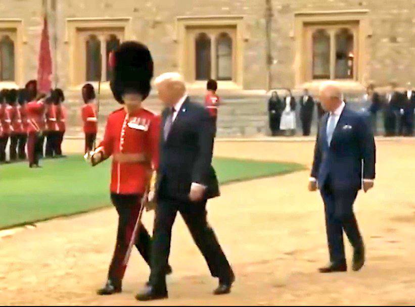 Дональд Трамп, который должен был идти рядом с королем, вырвался вперед и пошел с гвардейцем. Решил, что вот этот, нарядный, и есть король. Он, кажется, еще и что-то свистит гвардейцу. Про сделки, наверное, рассказывает. Гвардеец точно прихуел.Представляю, как вечером у камина будут хохотать Карл с женой! Такого унижения король не перенесёт. |