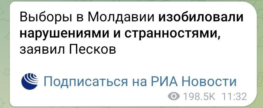 ![]() "Парламентские выборы в Молдове были жульническими, с откровенными манипуляциями голосами и задействованием ресурсов из-за рубежа Об этом заявил глава МИД РФ Сергей Лавров.(с) Дмитрий Сергеевич Песков тоже говорит, что в Молдове все прошло не так. Ни пеньков, ни трехдневного голосования, ни пирожков на участках. Сплошные странности |
