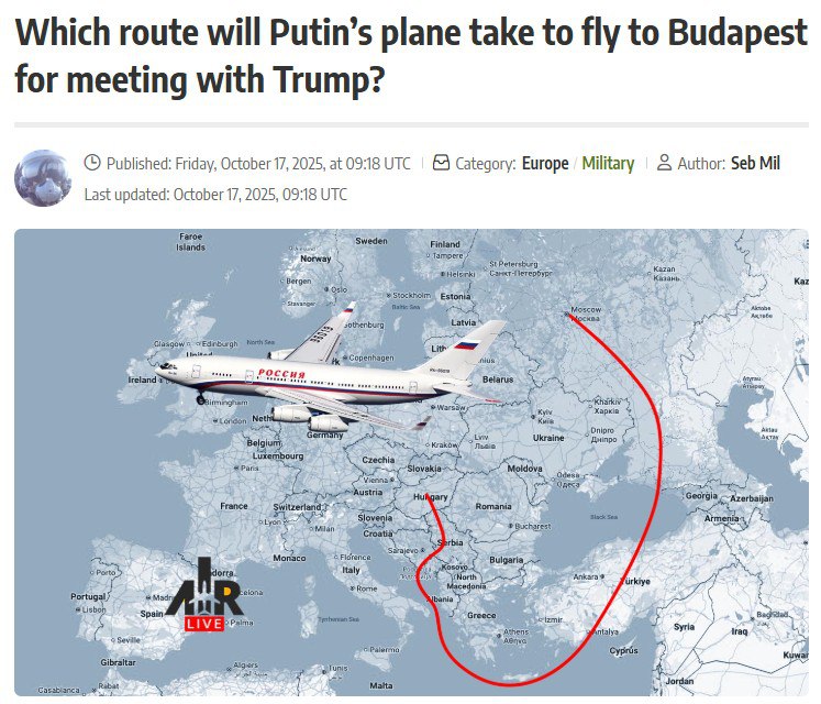 Маршрут президентского Ил-96 с Путиным на борту по пути в Будапешт на саммит по Украине с участием Трампа пройдёт через нейтральное воздушное пространство Чёрного моря, затем Турцию, Средиземное и Адриатическое моря, а также над Боснией и Герцоговиной и Сербией, сообщает AirLive. Странно что муж подружки президентской дочери не предложил выкопать тоннель Путина-Орбана для этого дела... Сообщение отредактировал капитал - 18.10.2025, 21:52 |