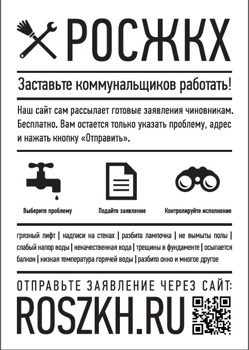 Сайт www.roszkh.ru автоматически рассылает готовые заявления чиновникам. Бесплатно. Вам остается только указать проблему, адрес и нажать кнопку "Отправить" Если у вас в подъезде отсутствует плитка на полу, повреждено лакокрасочное покрытие, не топят батареи, отсутствуют почтовые ящики, разбиты окна грязно в подъезде - то вам нужно посетить сайт РосЖКХ и отправить заявление чиновникам. Это займет у вас всего лишь 5 минут. После того как я отправил заявление через сайт, в моем подъезде сделали перила на лестнице и на крылечке. Правда трубы в подвале до сих пор протекают. Поскольку никто не торопиться их менять, отправил еще несколько заявлений в вышестоящие инстанции. По фактам изложенным в каждом вашем заявлении чиновники обязаны провести выездную проверку и принять меры к устранению нарушений. В мой дом приезжало две комиссии. Одна из УК ЖКХ и вторая из Государственной Жилищной инспекции. Если по истечении 45 дней нарушения не устранены, вы можете направить повторное обращение в государственные органы. По каждому новому обращению будет проведена проверка и вам придет ответ в письменном виде. Заставьте коммунальщиков работать. |