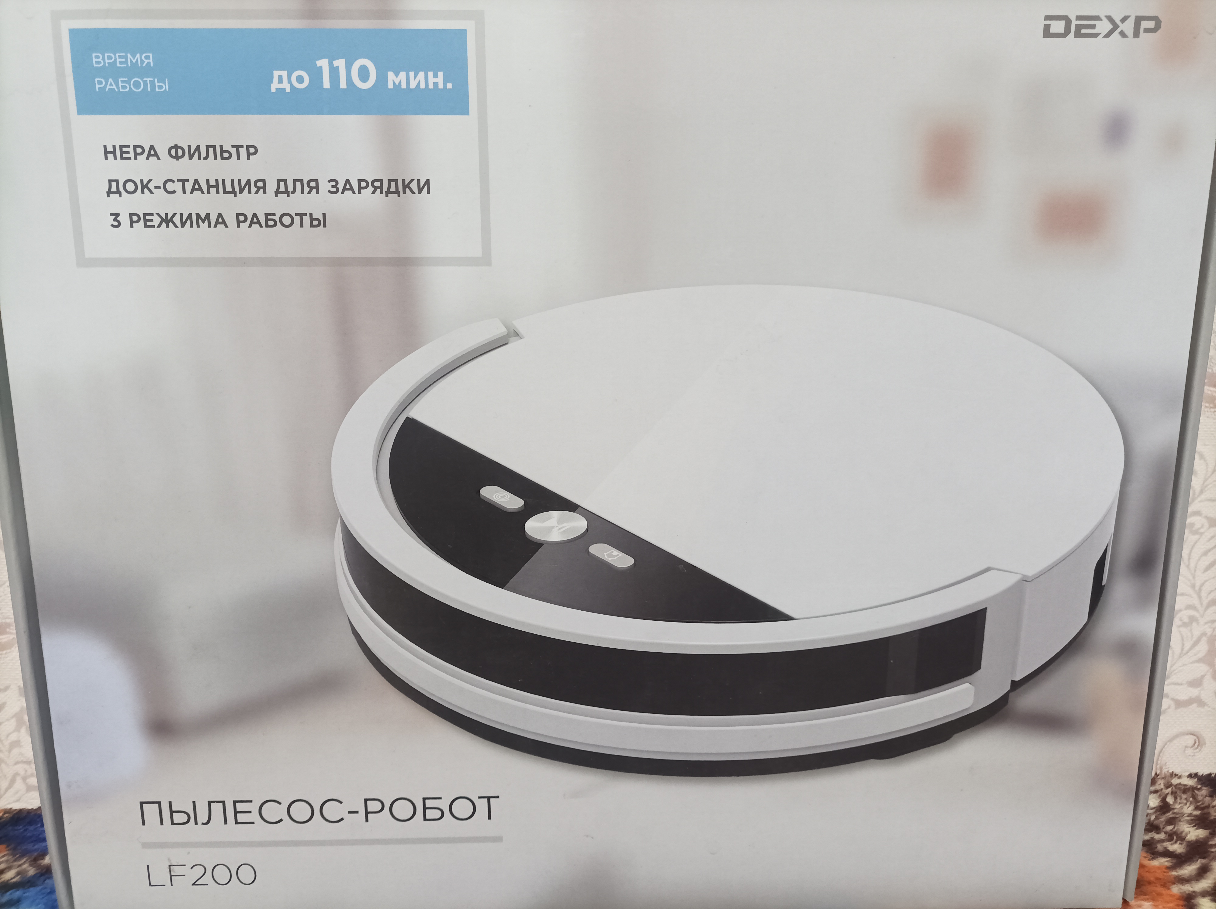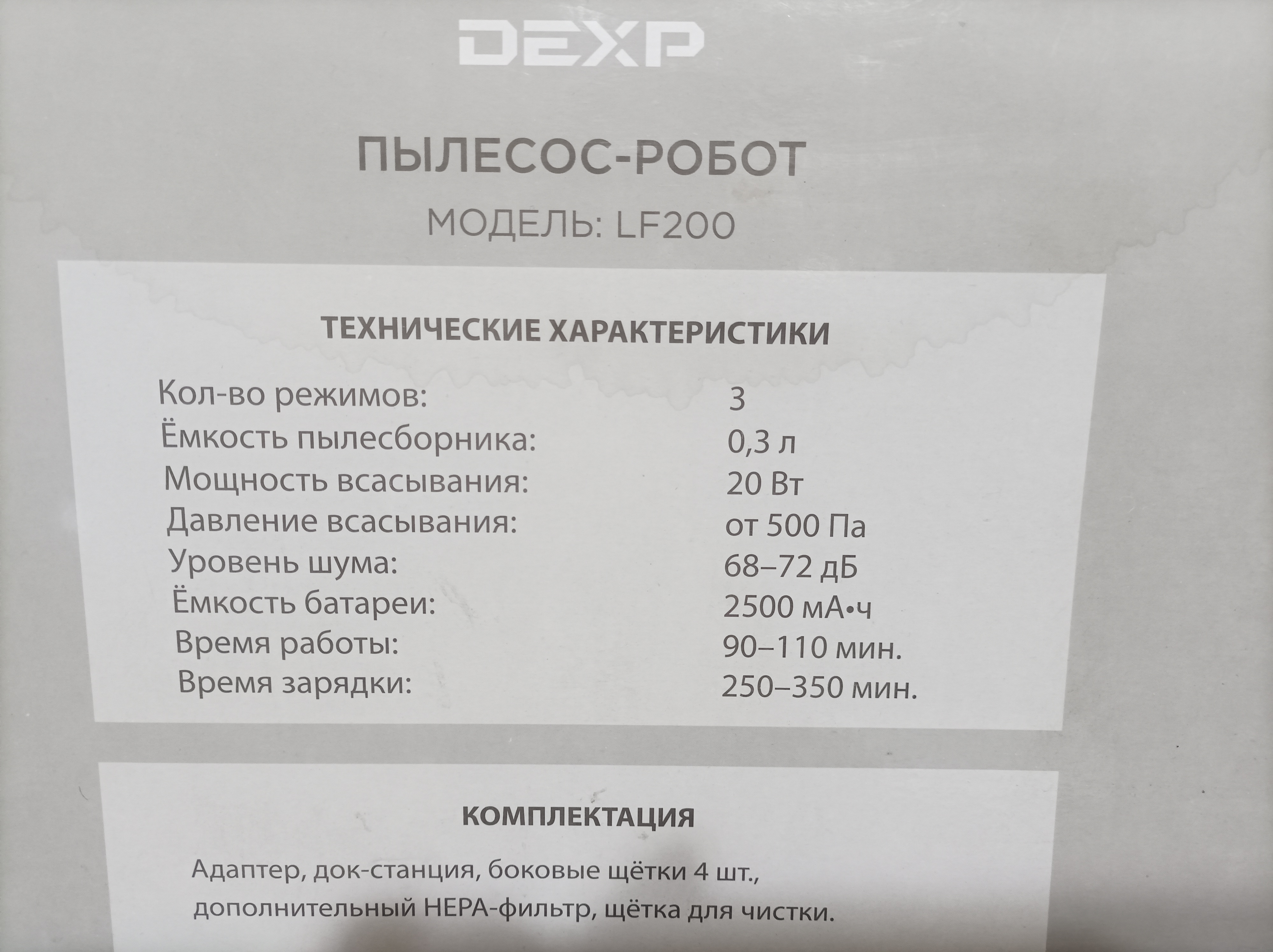 ПРОдается робот-пылесос DEXP , модель LF200, Кол-во режимов 3, емкость пылесборника 0.3 л, мощность всасывания 20 Вт, давление всасывания от 500 Па, емкость батареи 2500 мАч, время работы 90-110 мин, время зарядки 250-350мин, цена 3000 руб, тел: 8922 132 32 06[attachment=929838:IMG_2026...0_183648.