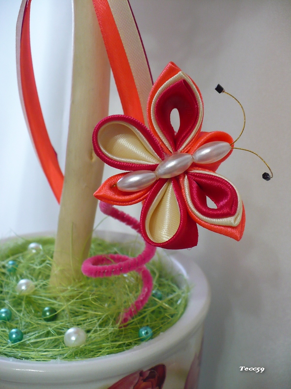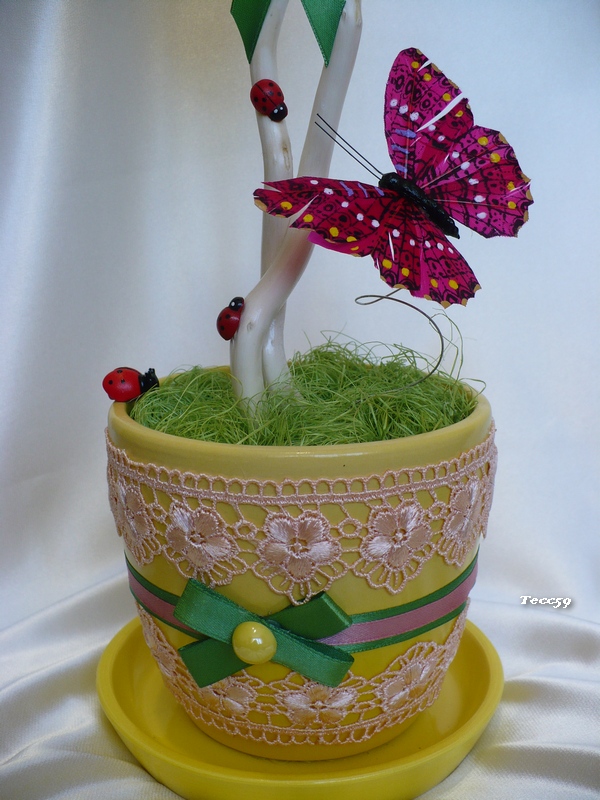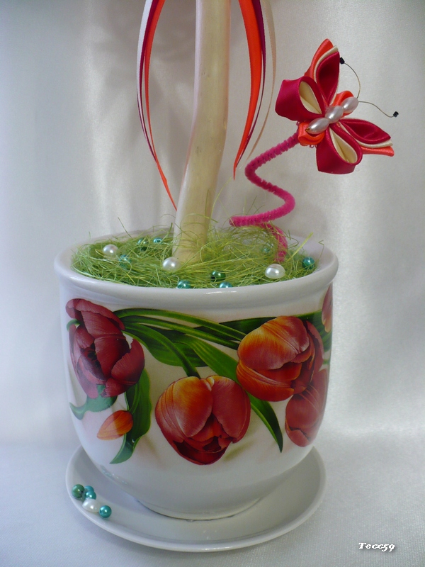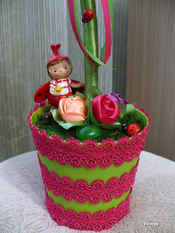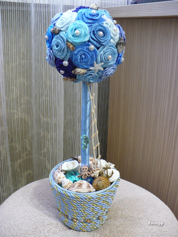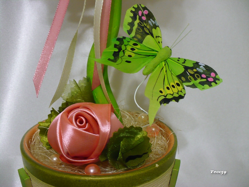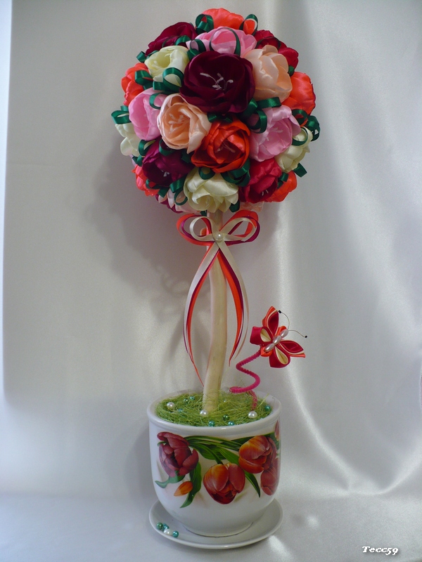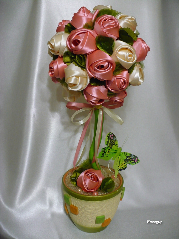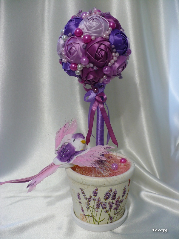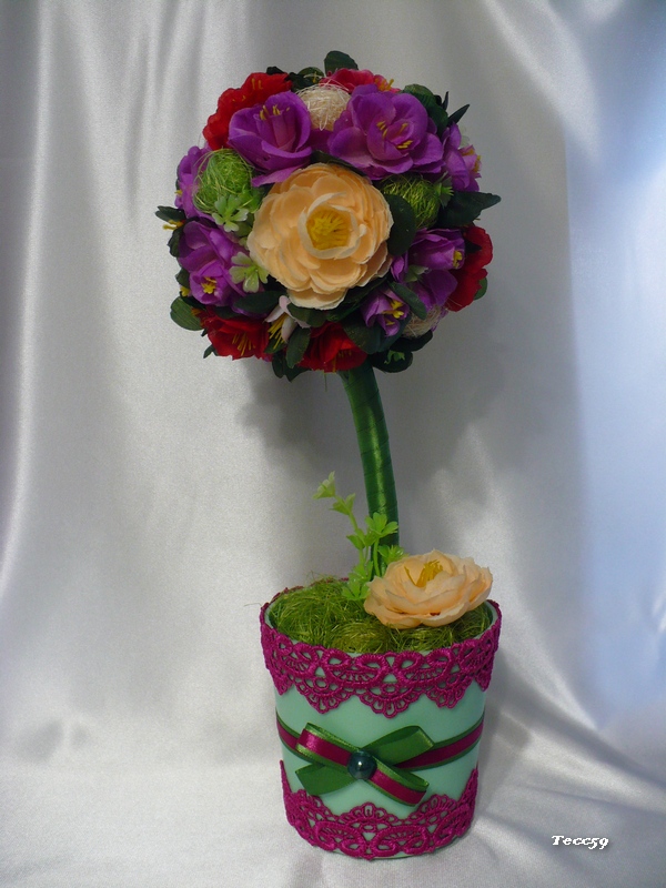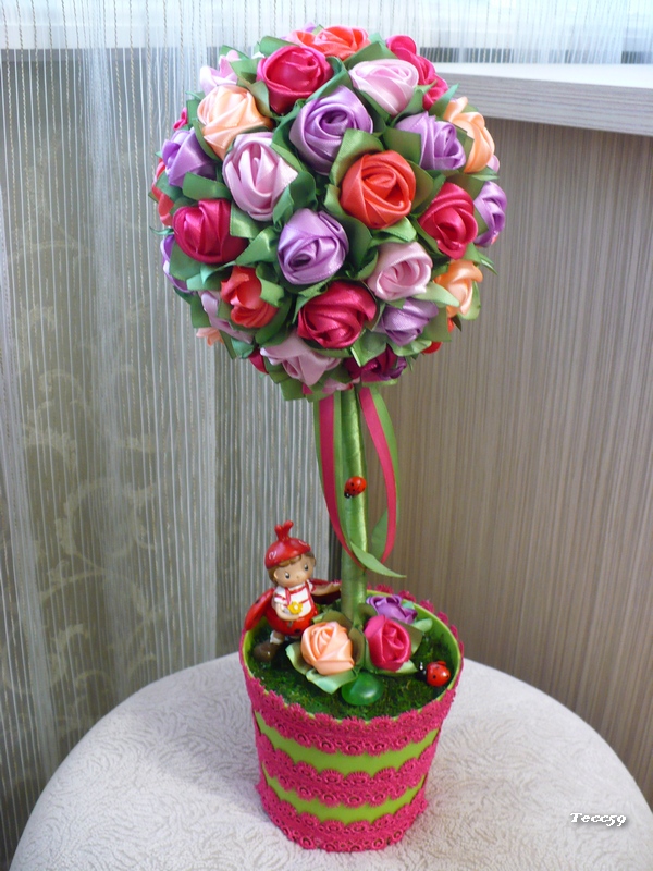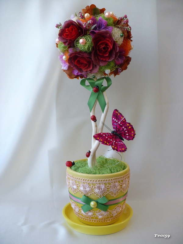 Топиарий внесет изюминку в интерьер вашего дома, офиса, квартиры. Будет приятным дополнением к освновному подарку, а также выступит как самостоятельный подарок! Часто Топиарии называют Деревцами счастья. Корни этого предположения уходят далеко на Восток. С давних времен считалось, что сгусток энергии, что-то сильное и приятное в эмоциональном смысле имеет форму шара. Потому считается, что такая форма деревца является своеобразным "контейнером", оболочкой позитивной энергии, которая и приносит счастье его обладателю. Поэтому подарив Топиарий, можно считать, что Вы дарите кусочек счастья. Новое деревце. Получилось высотой 47 см, цветы и бабочка ручной работы, использовалась атласная лента шириной 50 мм. |