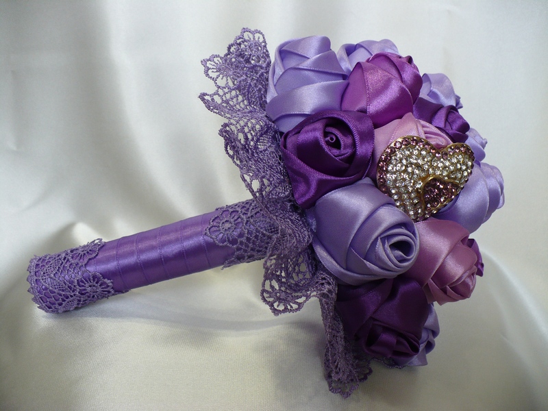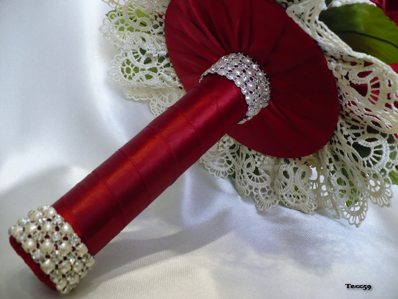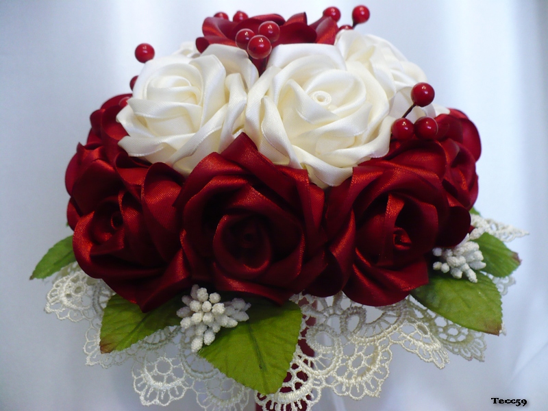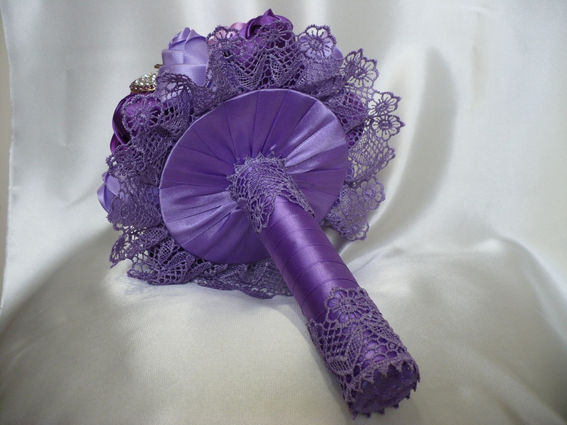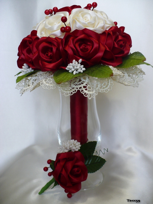 Новый букет для невесты или просто для любимого человека. Состоит из атласных лент цвета айвори и граната в объятиях нежного кружева и листочков роз. Завершением служит ножка, украшенная декоративной лентой под стразы. Такой букет достойно заменит букет невесты из живых цветов и будет радовать долгие годы. К букету есть бутоньерка. Очень красивый букет!!! |