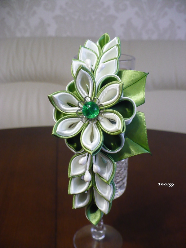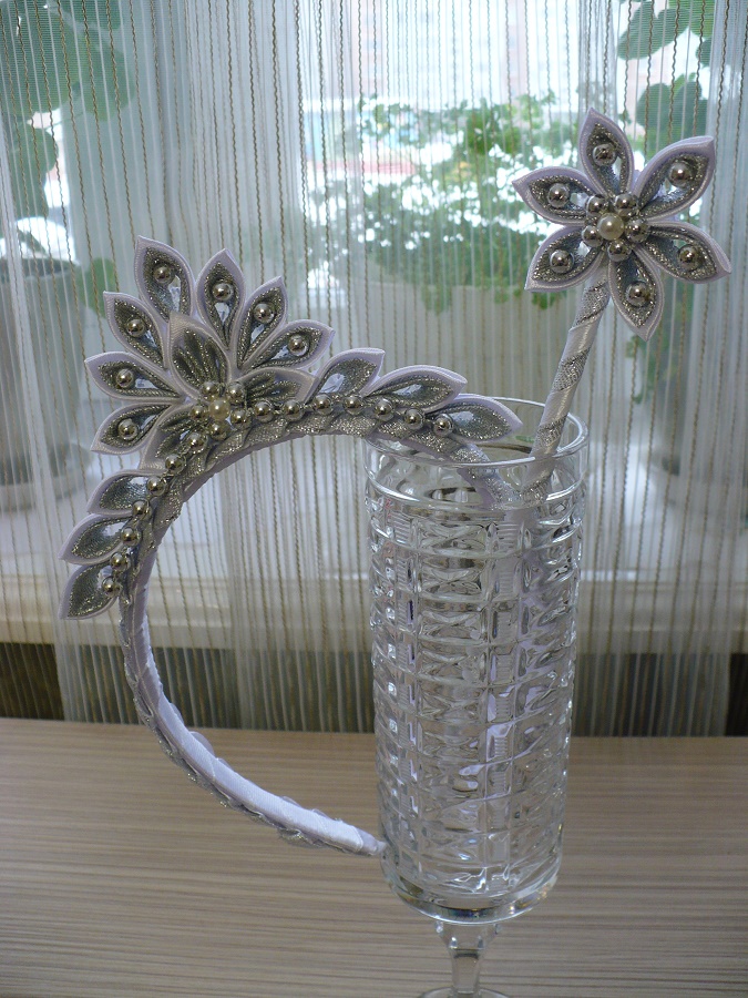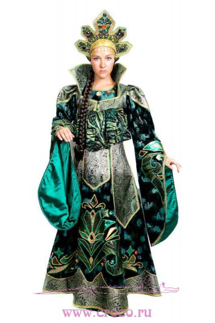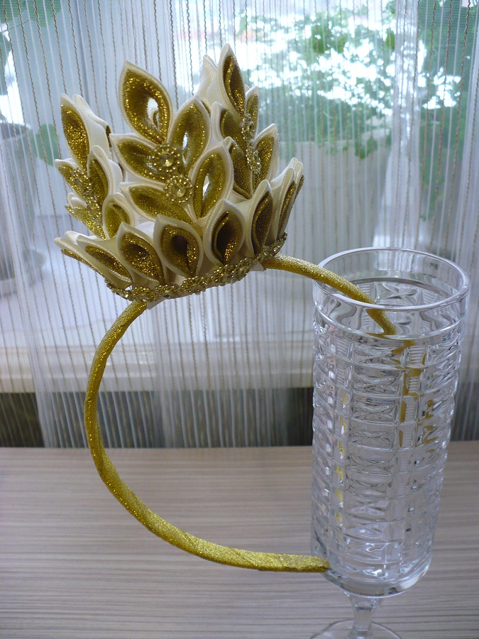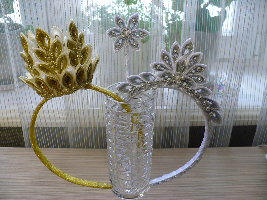 В своей работе я использую атласные ленты, элементы скрепляются с помощью спец.клея и ниток, поэтому короны не высокие, чтобы все хорошо держалось. Если нужно высокую типа кокошник, как на фото, нужно использовать картон и проволоку + фантазия оформления. Я не делала,т.к. таких заказов у меня не было. Могу сделать корону с зелеными лентами разных оттенков.