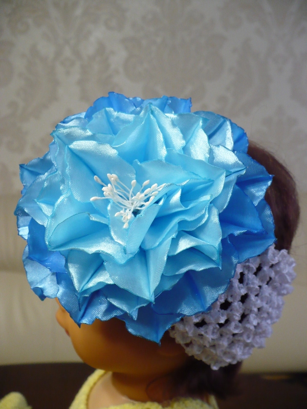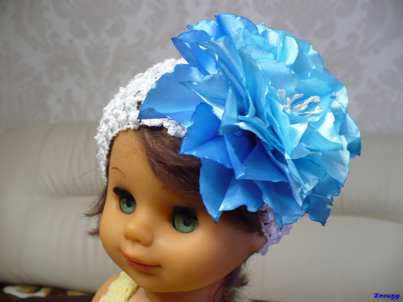 Спасибо. По поводу повязочки с бабочкой, то делала две на выбор. С голубым цветком забрали, а эта оказалась большая - диаметр 46см . Буду убавлять, т.к. размер еще увеличится за счет резинки.