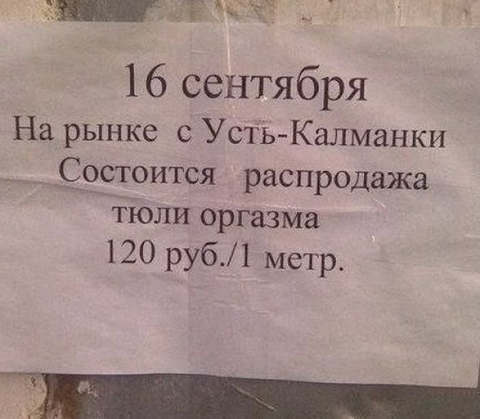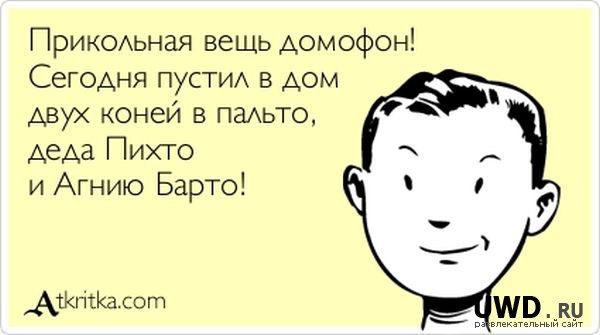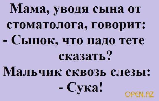 Стук в дверь. -Кто там? -Дед Мороз. -А не врёшь? -Век воли не видать... -Вчера ходила по магазинам. -Шопинг? -Зыринг! -Мадам,а что вы собираетесь делать вечером? -Рубашки тебе буду гладить ,дурень! |