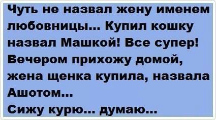 Приходит мужик на работу с фингалом, его коллеги спрашивают: - Откуда фингал-то? - Да, вчера на рынок ходил, и смотрю, передо мной женщина идет, толстая такая. И у неё попа платье зажевала... Ну, мне неудобно стало, я и вытащил... Проходит, неделя, фингал уже спал. А в понедельник он опять с фингалом идет. Ну, коллеги его опять спрашивают. - А теперь -то чё с другим глазом? - Да, та же история. Идем с другом по рынку, видим, опять эта толстая женщина идет впереди. И у неё опять попа платье зажевала... Ну, моему другу не удобно стало, он взял и вытащил. А я обратно засунул, и сказал, что она так НЕ ЛЮБИТ.. -------------------- Вот говорят, что счастье не в деньгах. Поверьте, плакать в своем пентхаусе на много лучше, чем в коммуналке...