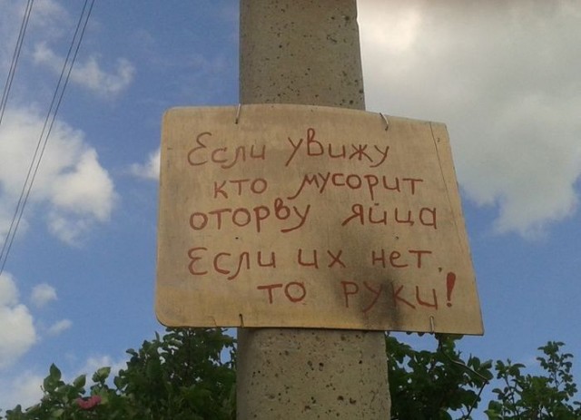 Надпись на воротах дома: "Собака не злая.Но имеет очень слабые нервы." |
