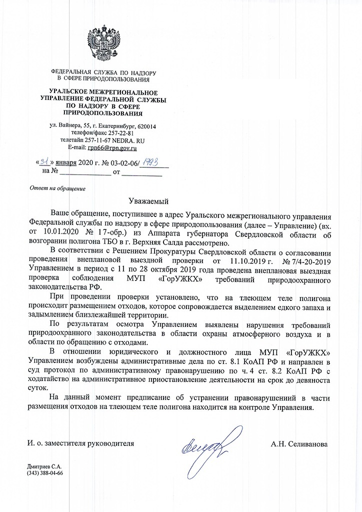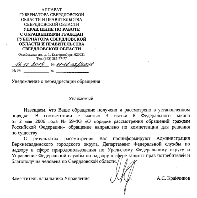 Губернатор переадресовал, надзорные органы отписались. Писать бумажки и ничего не делать очень удобно. Молодцы. Так держать. Глава Верхнесалдинского округа особо заморачиваться не стал - написал, что две проверки были, нарушений не выявлено. Так что пишите дальше Губернатору вместе с ответами администрации. и всё это надо дублировать в приёмную Президента. Сообщение отредактировал volkov - 16.2.2020, 22:46 |