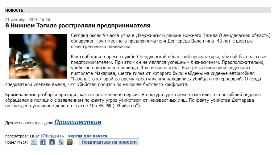 Камрады! Рука наших товарищей по борьбе покарала доносчика который писал кляузы на лидеров движения Льва и Михаила из Каменска. Суровая казнь заставит шавок выслуживающихся перед системой уважать наши принципы! Мы стоим на страже будущего нашей страны. Чем больше мертвых педофилов и их защитников-тем крепче здоровье и жизнь наших белых детей. « Сегодня в городе Нижний Тагил был убит Валентин Дегтерев…» |