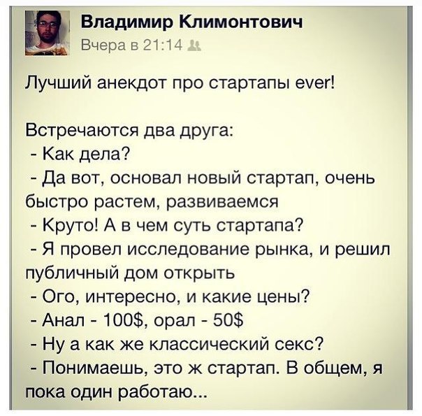 Из Инета. Люблю наши приметы. Рассыпал соль— к ссоре, разбил тарелку — на счастье, пересолил — влюбился. Легче во всем видеть какой-то символ, чем признать, что у тебя просто руки из жопы. Приходит мужик к доктору с гвоздем в голове. Доктор: — Что, вытащить? — Да… — С вас 10 тысяч… — Но у меня же полис! ? — По полису мы вам можем его только загнуть, чтоб не мешал. — Что должен сделать настоящий мужчина после романтического ужина? — Помочь даме сжечь приобретенные за ужин калории. Муж после многочасовой игры в танчики заходит на кухню: - Дорогая, а есть что покушать? - А че,… полевую кухню разбомбили? -------------------- Каждое мое высказывание - это оценочное мнение происходящего.