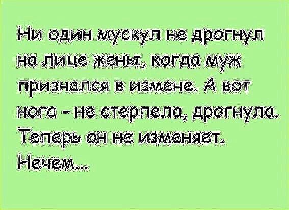 Зима. Сидят на ветке три воробья. Взъерошенные, мёрзнут. Первый мечтательно так говорит: - А я сейчас бы поел. Черной икры на кусочке белого хлеба. Второй: - Я бы не отказался и от красной икры на кусочке черного хлеба. Тут вступает третий: - Хорош трепаться. Следите за лошадью, а то без горячего останемся ! Нашла у мужа контакт в телефоне "Бесплатный ceкc". Ради любопытства позвонила... Когда зазвонил мой сотовый,чуть со стула не рухнула... Вооот СУКААААА! Прилетел Карлсон к любовнице и начал делать свое дело. Тут звонок в дверь: муж пришел. Карлсон: Не волнуйся, я в окно вылечу! Так и сделал. Муж войдя: Жена, кто у нас был? Жена: Никого. Муж: А чьи это штаны с пропеллером? |