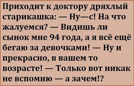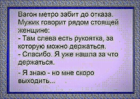 — Циля, таки запомни: мастерство женщины заключается в том, чтобы умело выдать свой гарпун за стрелу Амура! 😂 😂 😂 — Софочка, ты вся такая воздушная… — Шо, как безе? — Нет, как тревога! 😂 😂 😂 — Яша, где твоя тряпочка? — Какая? — В которую ты сейчас молчать должен! — Циля, таки запомни: мастерство женщины заключается в том, чтобы умело выдать свой гарпун за стрелу Амура! 😂 😂 😂 — Софочка, ты вся такая воздушная… — Шо, как безе? — Нет, как тревога! 😂 😂 😂 — Яша, где твоя тряпочка? — Какая? — В которую ты сейчас молчать должен! Мужчины делятся на два типа: те, кто может поднять холодильник на пятый этаж, и те, кто таки может заплатить за это. 😂 😂 😂 — Яша, этот мужчина смотрит на меня уже целый час! — Да, я заметил. Наверное, антиквар. 😂 😂 😂 — Сема, помнишь, когда тебе было плохо, я сварила тебе суп? — Нет, Циля, ты сначала сварила суп, а потом мне было плохо! 😂 😂 😂 — Интересуюсь спросить, a твой муж помнит за дaту вaшей свaдьбы? — К счaстью, нет. — А с чего это «к счастью»? — Я напоминаю ему об этом несколько рaз за год и кaждый рaз получaю подaрки! |