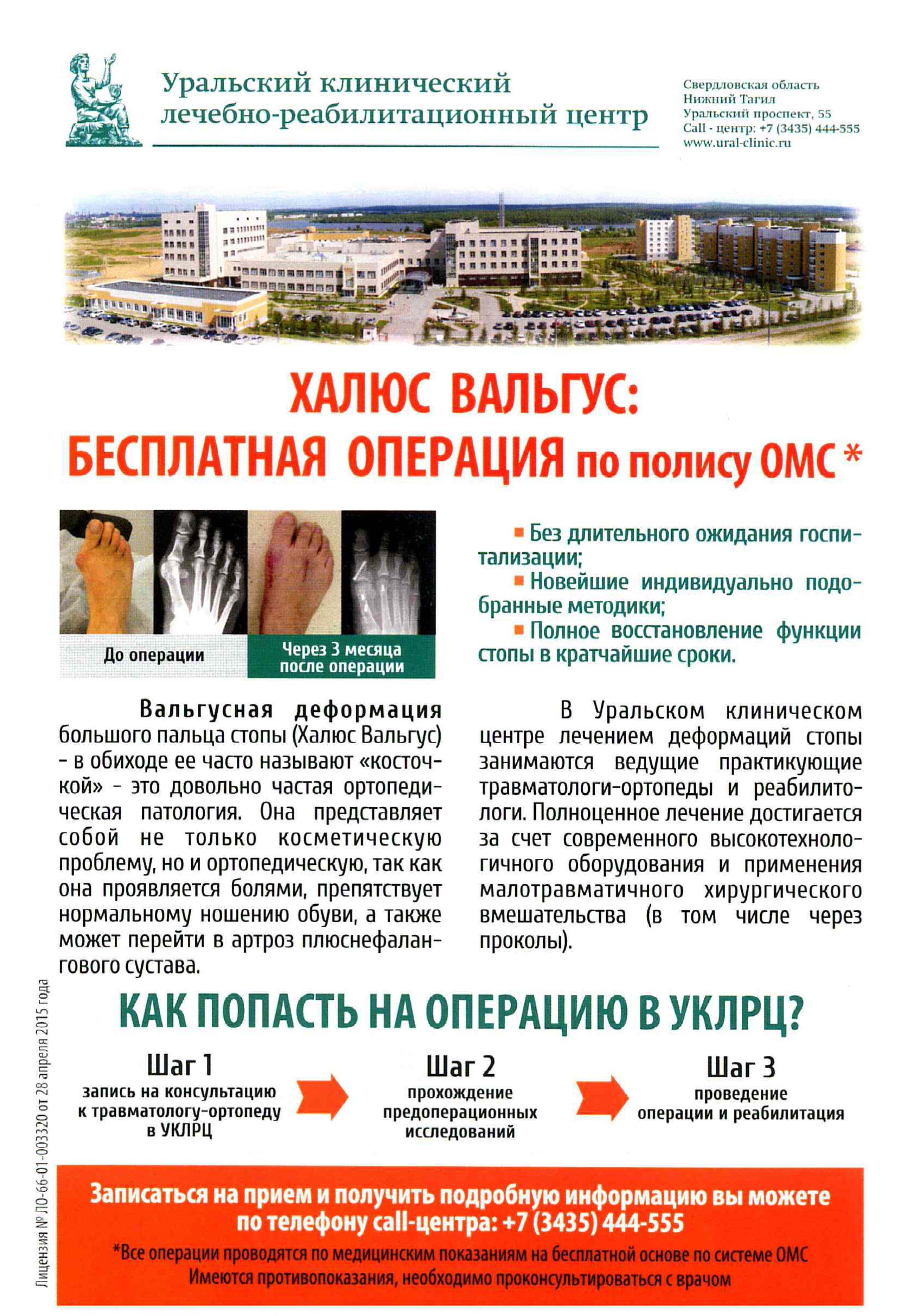 Сейчас в поликлинике УКЛРЦ ведут прием врачи травматологи-ортопеды, ведется отбор на операции по эндопротезированию тазобедренного сустава, а также больных с "шишками, косточками" на стопах (вальгусная деформация большого пальца стопы, поперечное плоскостопие)-по этим заболеваниям операции возможны уже в этом году по ОМС.