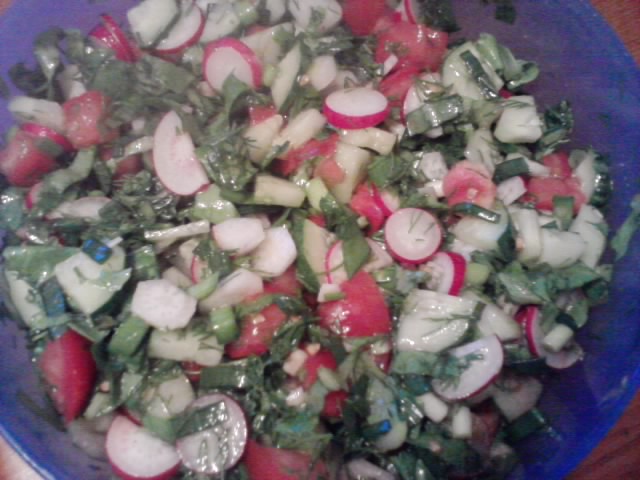 кроме огурцов и помидор всё выращено старым дедовским способом на огороде ( шпинат, салат, кресс- салат, кинза , редис, лук, укроп, щавель и ботва редиса ) , без кинзы такие "вещи !!!" есть не сяду , а скоро и базилик поспеет, ваще , как кошка под " наркозом " ходить вокруг грядок буду...