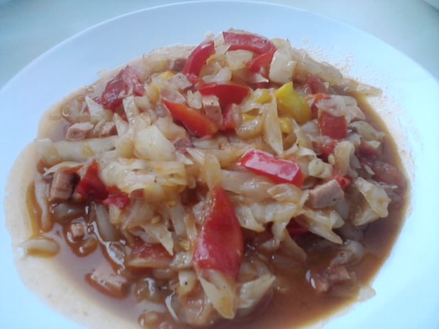 Потушить ( это в смысле обжарить капустный салат на сковороде на маленьком огне, даже если он с майонезом, будет только вкуснее) , отдельно обжарить мясо ( можно просто добавить тушенку или колбасу), короче мясо забрасываем в капусту, отдельно обжариваем лук , морковь , помидоры и туда же ( можно ограничится томатной пастой, но тоже обжаренной ) еще потушить, добавить специи : перец, лавр. лист, что нибудь ароматное из кавказской кухни( типа хмели - сунели ) и кушайте...