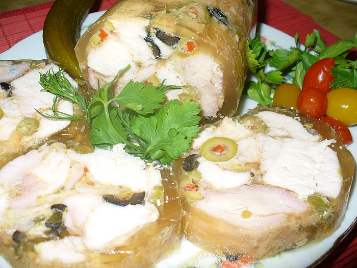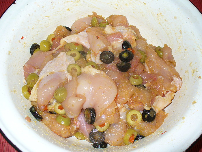 Куриное мясо режем крупными кусками, смешиваем с оливками, солим, добавляем аджику, специи на свой вкус и высыпаем прямо в мясо желатин (прямо сухой)