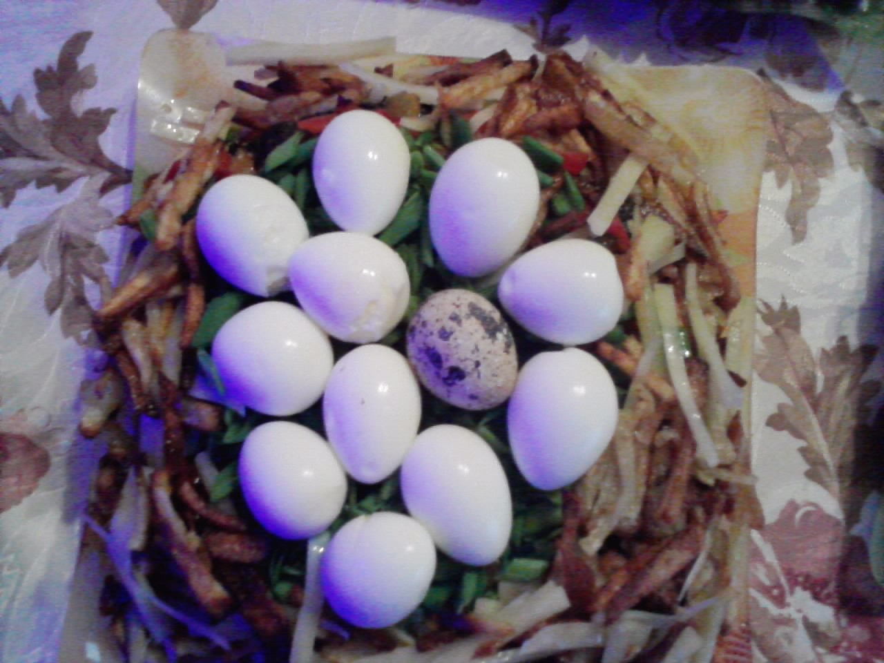 Для украшения купила сыр Пармезан, порезала его тонкими , длинными полосочками, сделала картофель фри ( тоже тонко порезанный), перемешала сыр с картофелем и облепила края салата , в центр салата укладываем отварные перепелиные яйца .