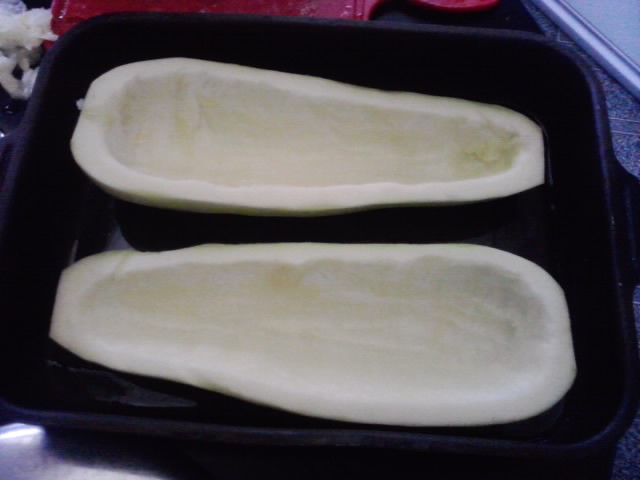2 кабачок почистила , разрезала попалам, выскребла из серединки всё ненужное ( ну , чтоб стеночки у него остались в 1 см