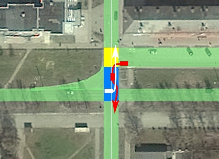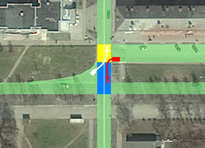 Нажмите для просмотра прикрепленного файлаЧто касается местного уширения, или третьей полосы для поворота налево – это очень неудобная позиция для поворота и потенциально опасная в плане дтп, т.к. морда автомобиля смотрит прямо на встречный авто и чтобы разъехаться с ним, нужно сдать правее проехать вперёд до края проезжей части и повернуть налево. Либо разъезжаться правыми бортами и выехать на встречку. Между тем, как поворот со второй полосы безопаснее и позволяет свободно разъезжаться левыми бортами со встречными авто, но является нарушением правил на данном перекрёстке.
