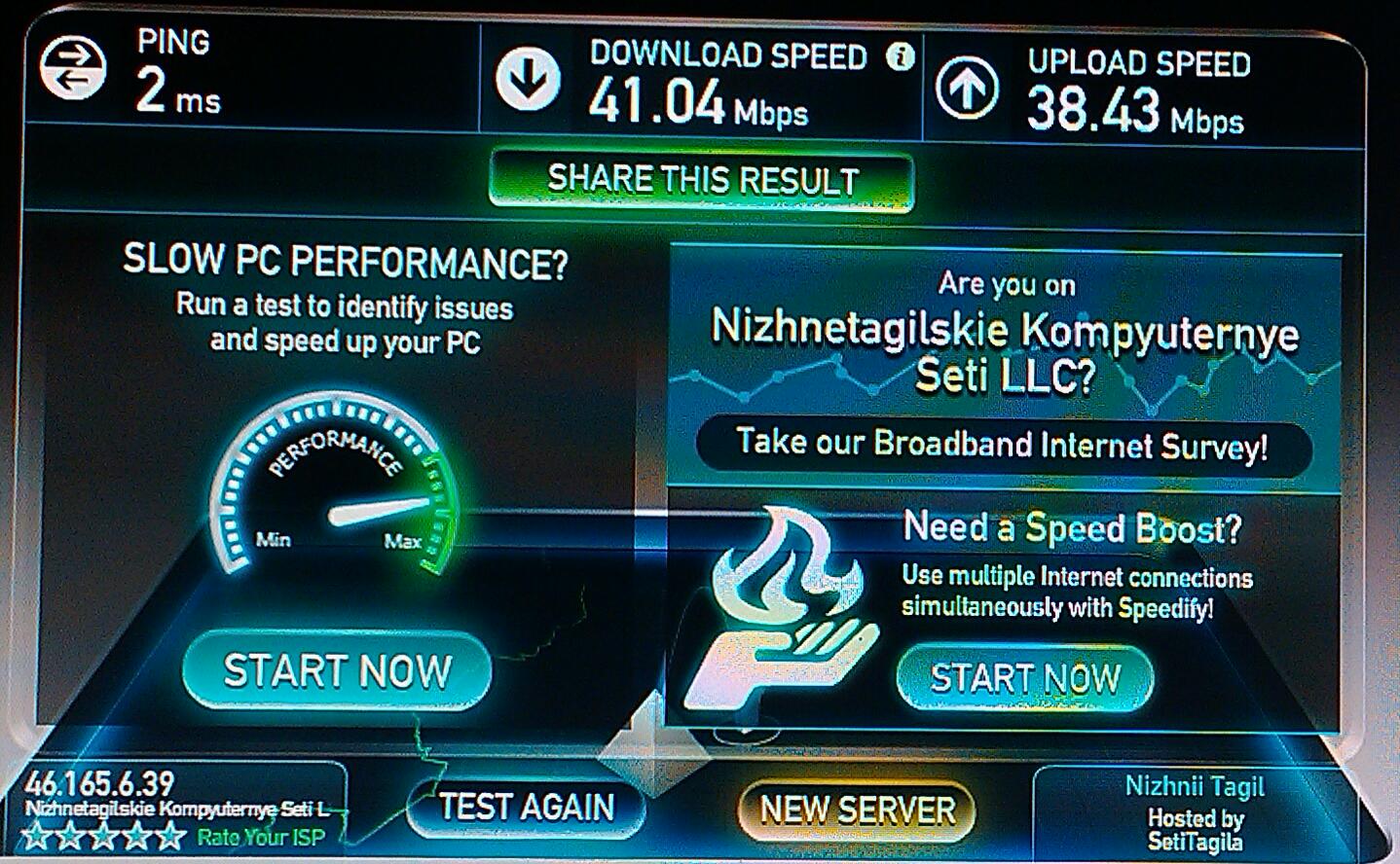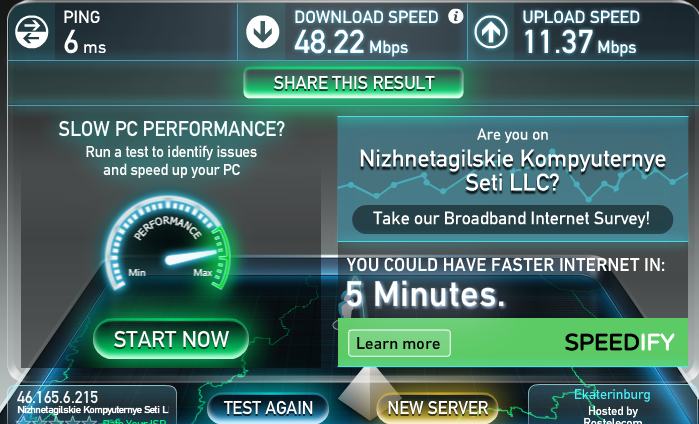 Спасибо за ответ! Скорость по вашей ссылке такая же (40) . Проблема может быть в роутере? Друзья до Н Тагила на тарифе 40 получают скорость под 100. Я просто хочу разобраться)))