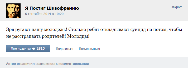 а я соглашусь... этой суицидной херней страдают в основном дети из вполне благополучных семей, кого реально по жизни не напрягали, а только оберегали... недавно вон из Ревды девченка (на Е1 было) поступила с институт, неделю проучилась и повесилась, а до этого с родителями в коттедже в тепличных условиях жила и мало общалась со сверстниками... китайцы и кавказцы такой херней страдать не будут, они с детства знаю чего от жизни хотят и рвут всех вокруг, а не меланхолией от беспомощности страдают... потому что правильно научены с детства, что старших надо уважать и старшим надо помогать, и в жизни надо к чему-то стремиться... а у нас сюсюкаются с малолетства и до 30 лет с детём