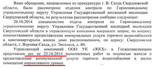 После полученного из ГЖИ ответа, засомневалась, пошла узнать какой нормативный уровень горячей воды в ЖКХ города Верхняя Салда.