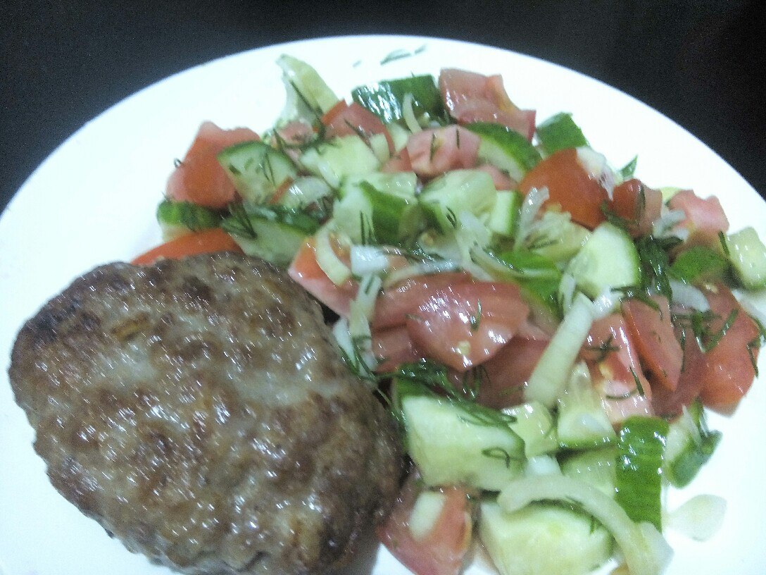 И добиваем салатом из огурцов / помидор в 100 г которого в среднем 60 кал это примерно/130- 150 гр салата