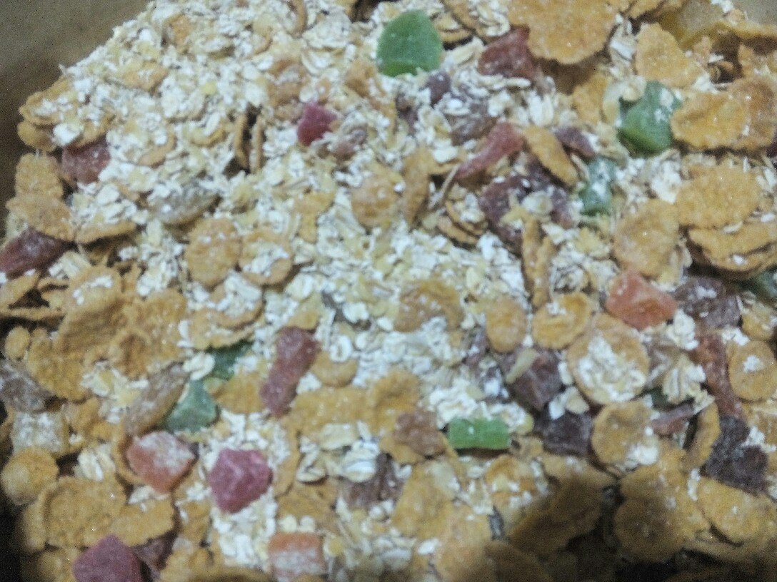 Перемешиваем с зерновыми хлопьями, добавляем кукурузные и вуаля вкусный сытный завтрак готов. Осталось добавить на ваш вкус в молоко, кефир или сок ...