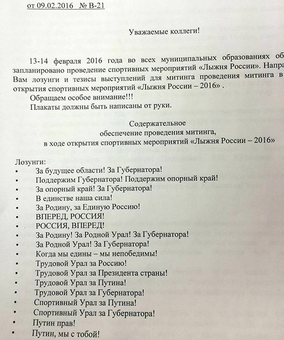 Посмотрел фоторепортаж по лыжне России в Нижней Салде 6 февраля - ни одного плаката (ни от руки, ни в другом исполнении) не увидел...