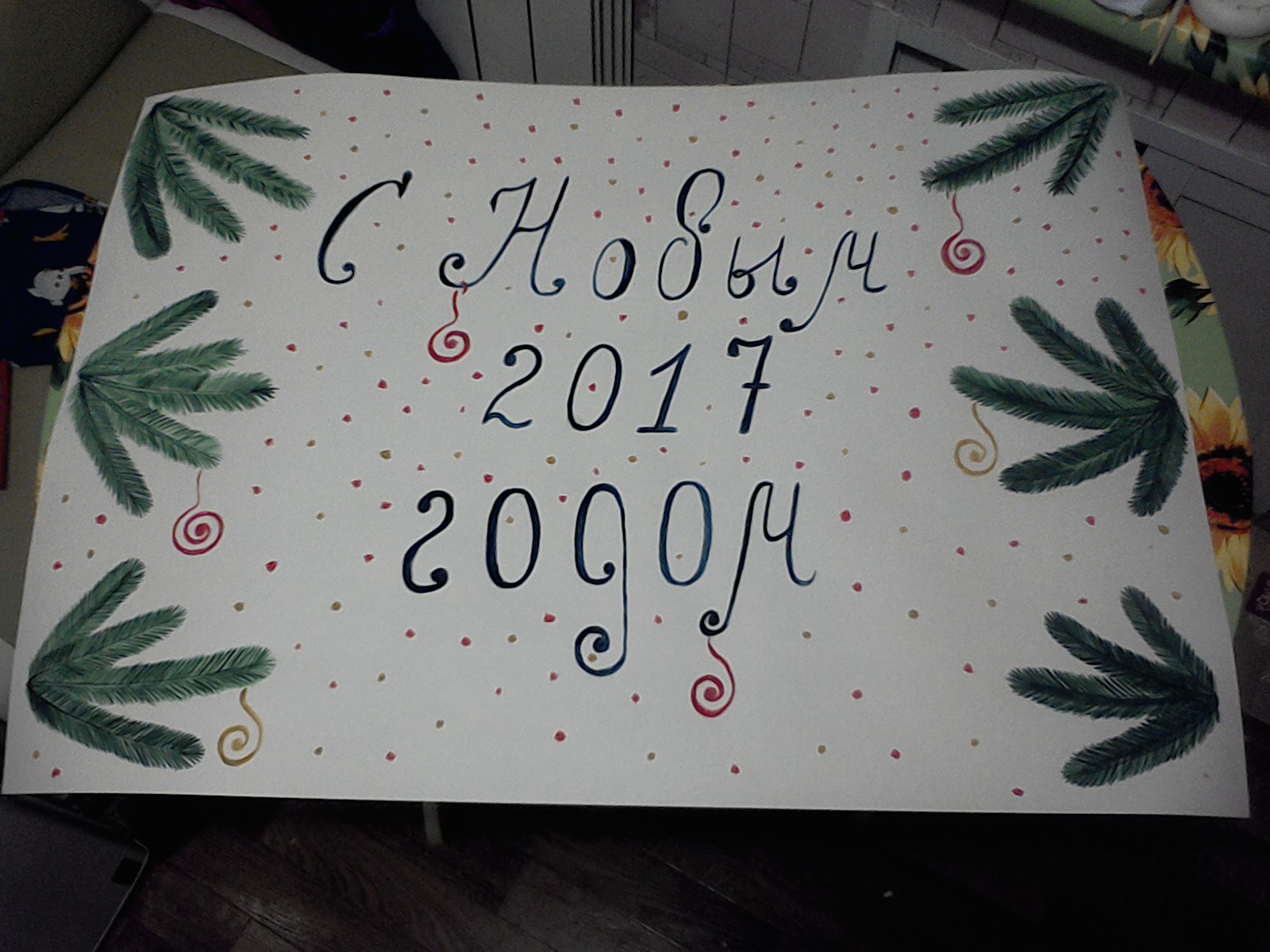 Ёлку давно не ставлю,просто еловые или сосновые ветки в 3-х литровую банку с водой. 3-5 игрушки,мишура.