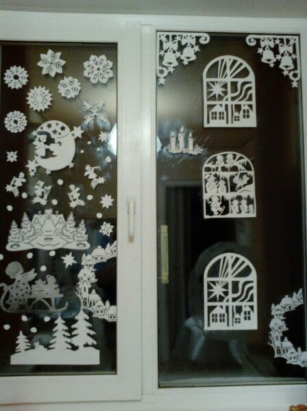 Можно конечно из альбомных листов, они более плотные , но тут придется рисовать каждую в виде трафараета и потом очень аккуратно выстригать ножницами , потому что когда клеешь на окно эти огрехи не видны ,тут же не много по другому ..