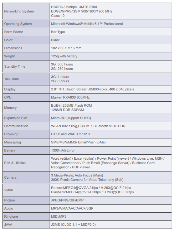 2,8-дюймовый экран разрешением 480x640, HSDPA, Wi-Fi, GPS, bluetooth, 256MB встроенного хранилища и 128MB DDR SDRAM, возможность записи видео на 24fps — все, чем может похвастаться новый телефон.