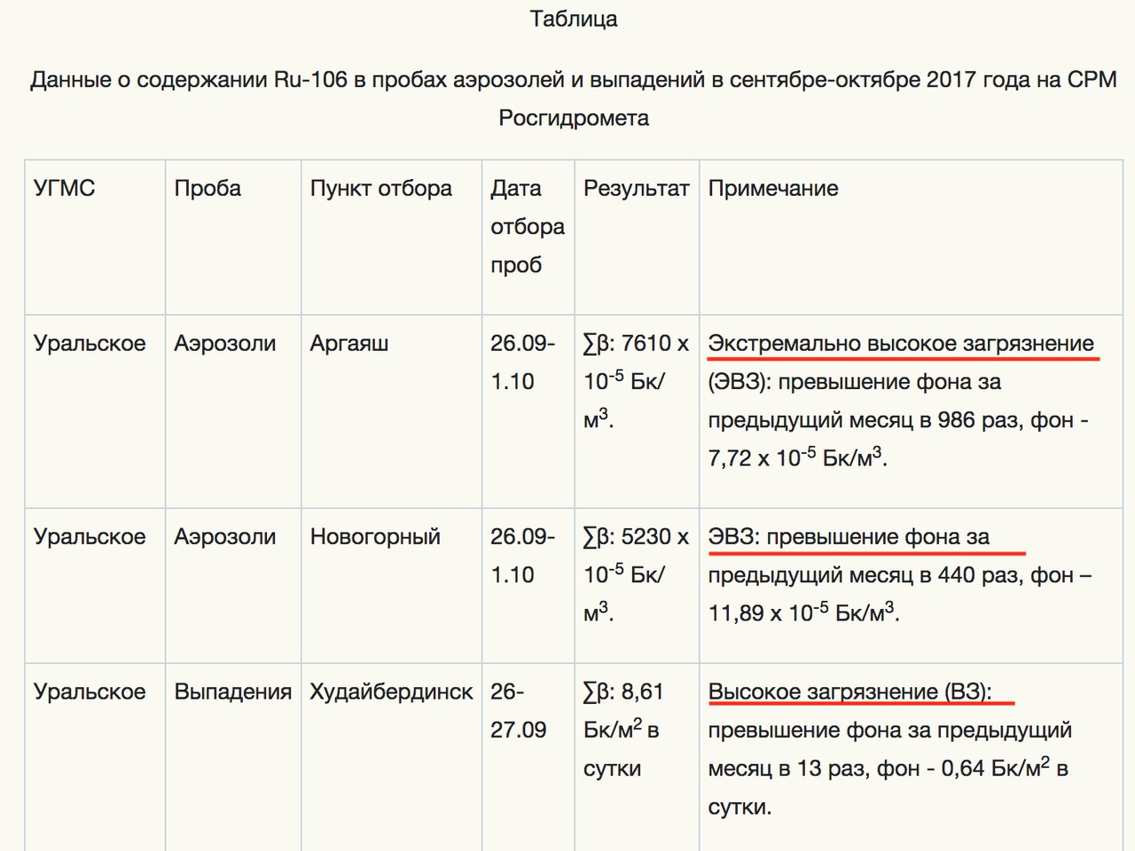 Росгидромет опубликовал бюллетень о радиационной обстановке на территории России в сентябре этого года. Наибольшая концентрация рутения-106 наблюдалась в Челябинской области в зоне ПО «Маяк». Загрязнение лабораторных проб характеризуется как «экстремально высокое» и «высокое». Так, например, на пункте в Аргаяше фон по сравнению с предыдущим месяцем был превышен в 986 раз.