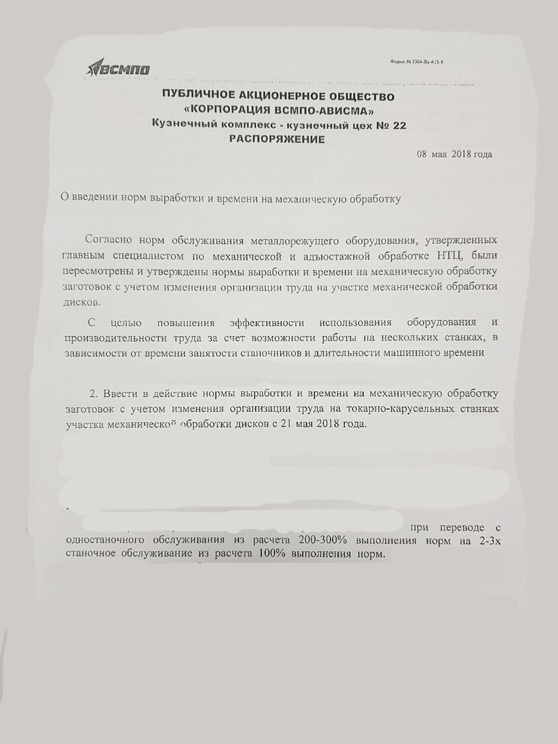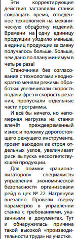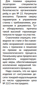 Это стало не устраивать наше руководство, и они просили чуть "поднажать", тем самым склоняя нас к нарушению технологий (привыкли к тому, что на протяжении многих лет Мы выдавали им каждый месяц по 400-450% годной продукции). Но, нарушать Мы больше не хотим ради того что бы нас лишали всего. Дальше, были перерасчитаны нормы и повышены режимы обработки до тех, на которых Мы работали. Теперь, Нам дают программы скорректированные нашими токарями на протяжении многих лет, которые изъяли у токарей.