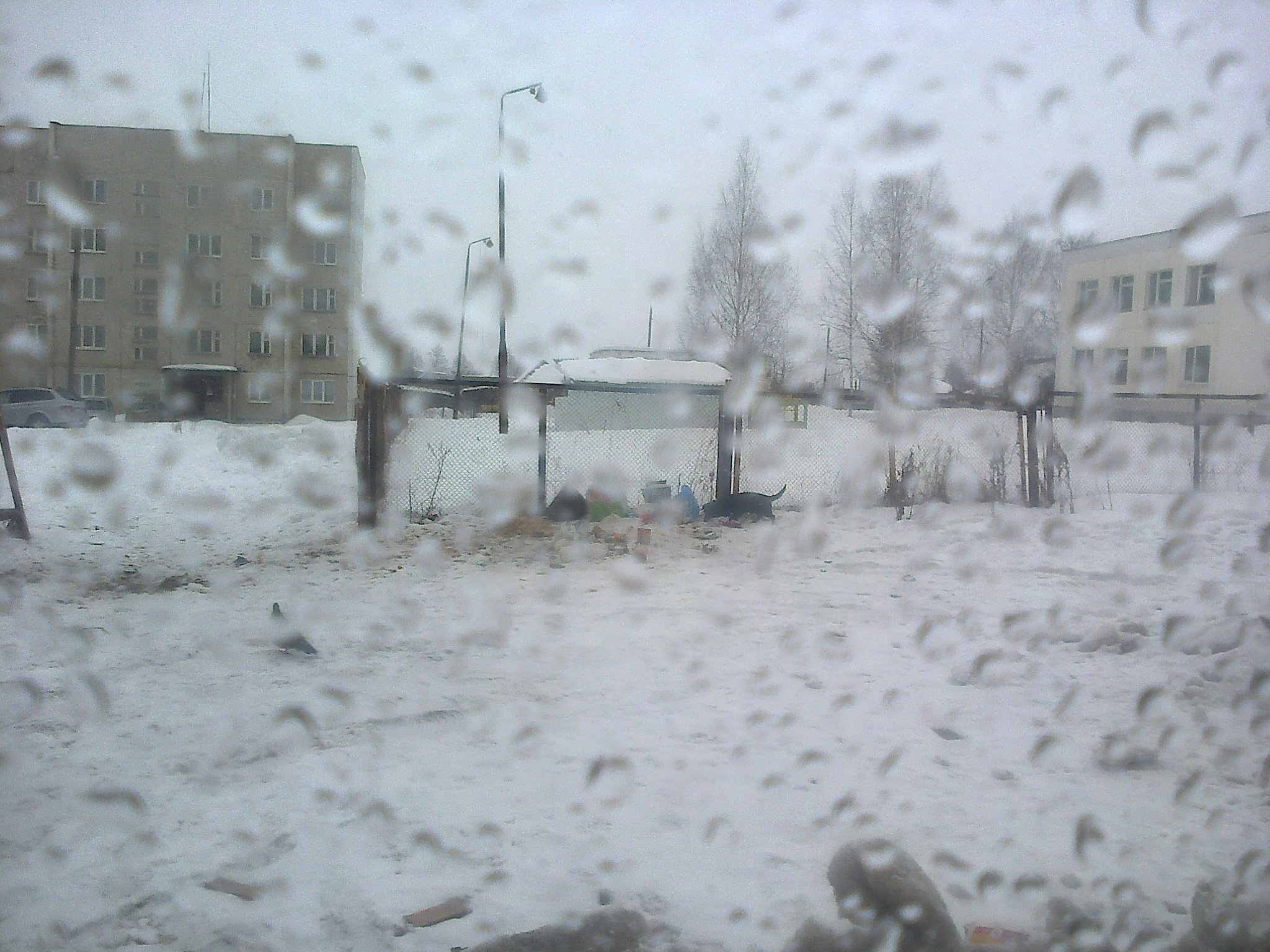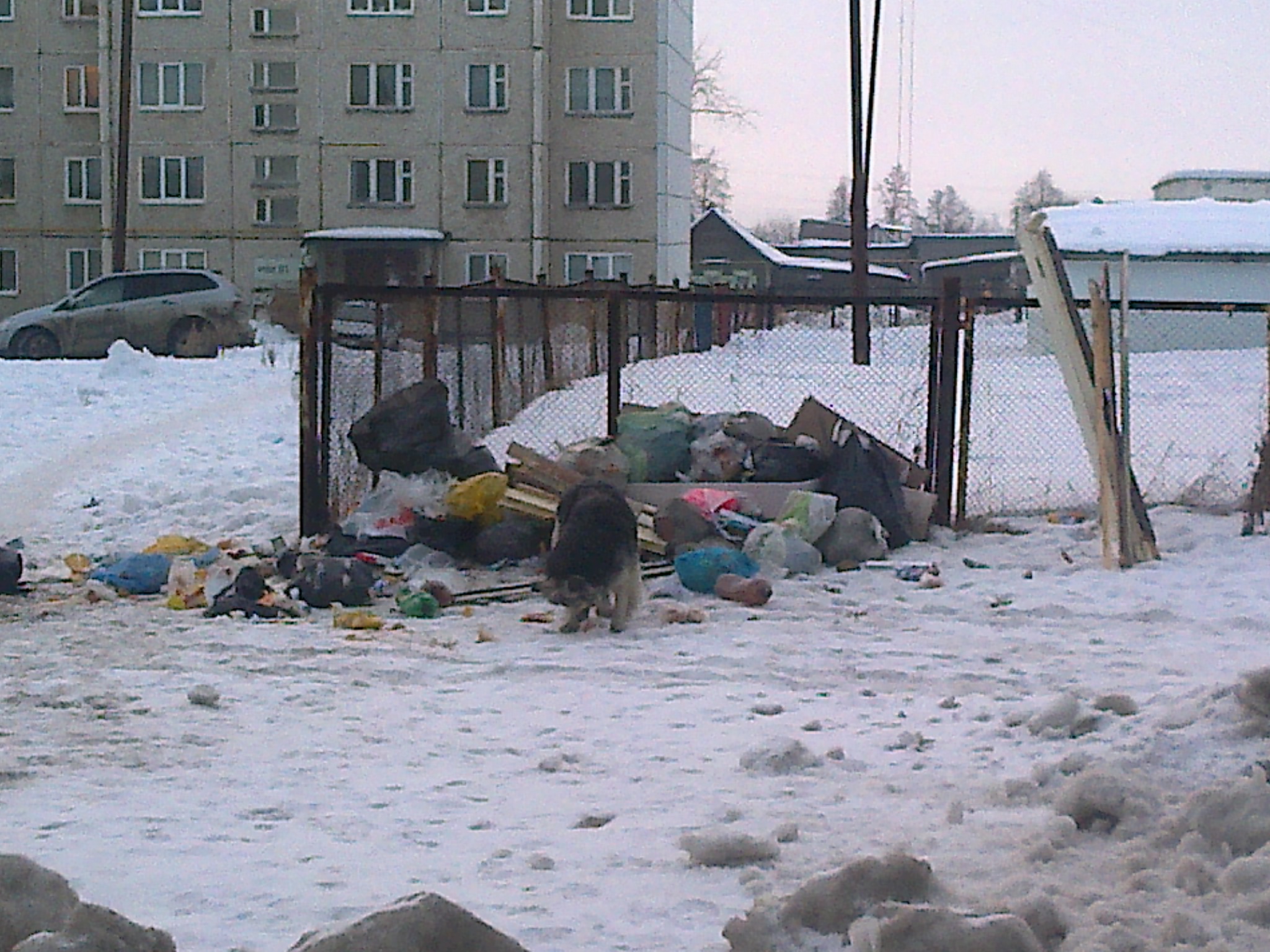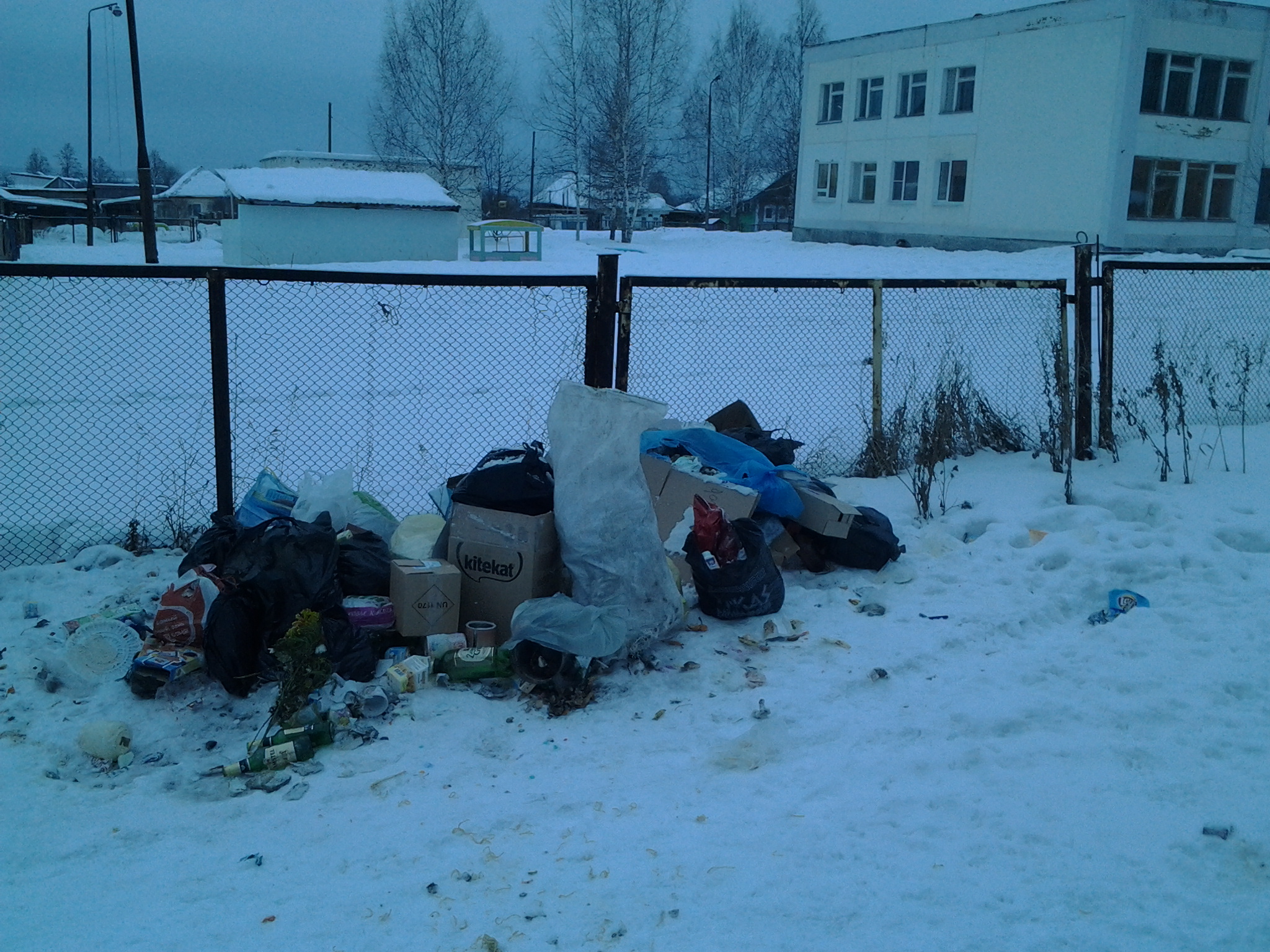 Сегодня в 15 часов жители уже успели выкинуть к забору 4 пакета. (Фото плохое, из окна машины, снег шел, но видно, что пусто там относительно и нет того что было утром.)