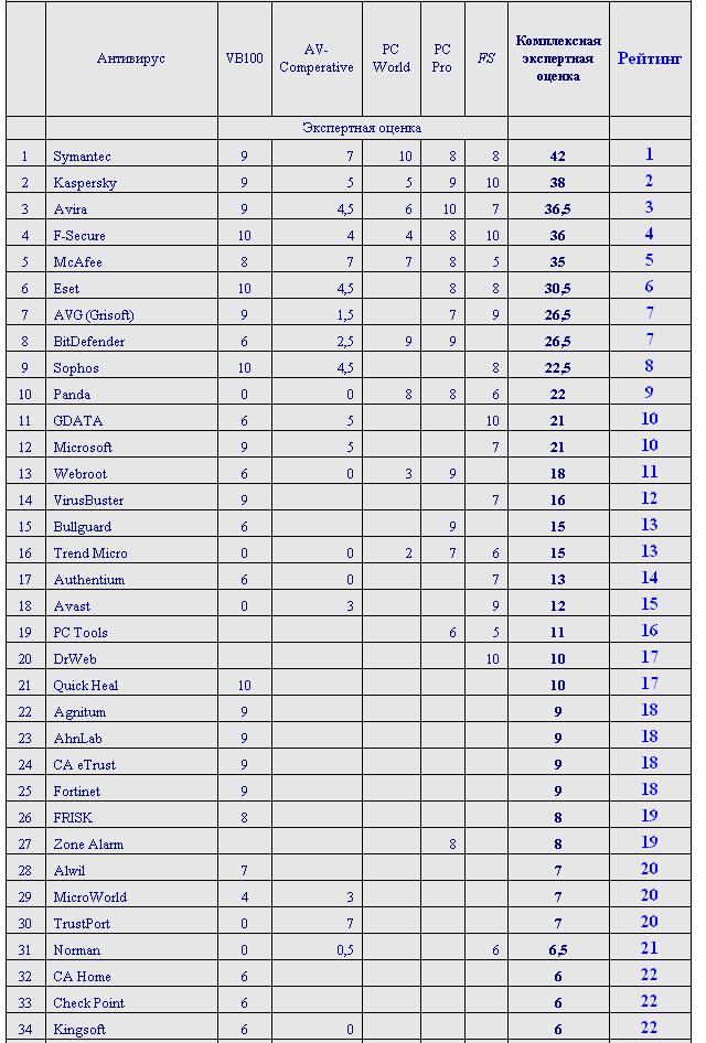 Несмотря на трудности сравнения результатов тестов антивирусов, составим итоговый рейтинг антивирусных средств защиты, на основании данных, полученных наиболее авторитетными экспертными компаниями и тестовыми лабораториями, который поможет сделать объективный выбор лучшего антивируса на текущий момент времени.
